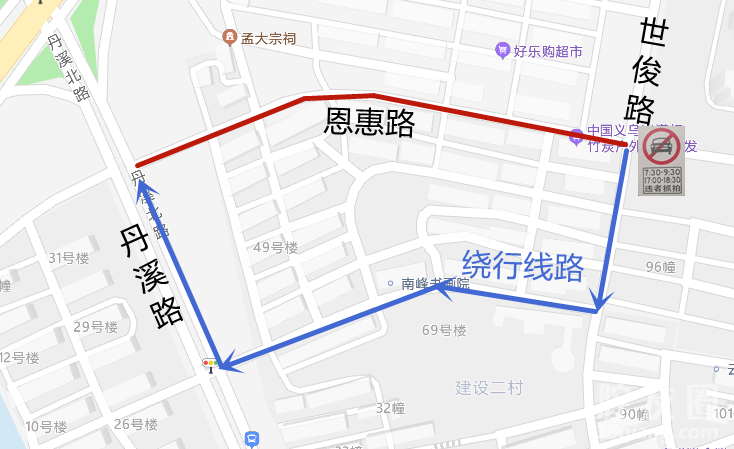 分别于以下两个时段(7:30-9:30、17:00-18:30禁止车辆沿恩惠路从世俊路往丹溪路方向行驶。