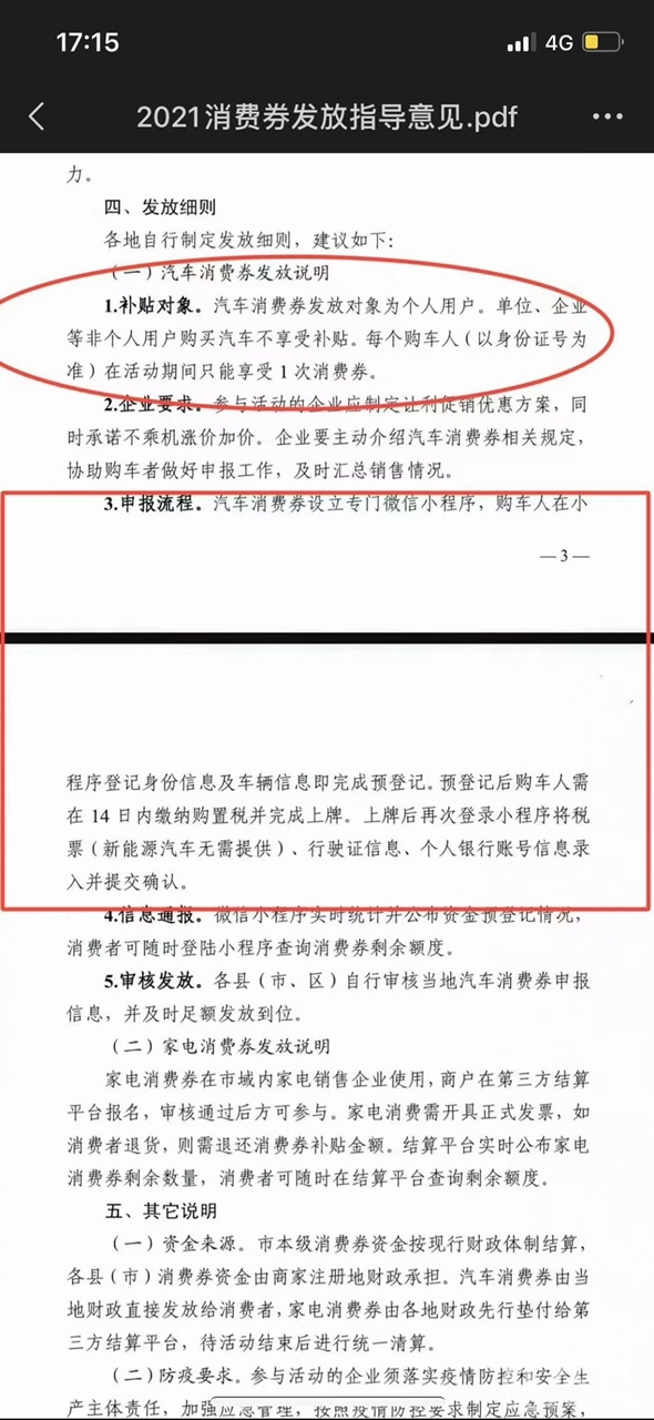 3. 申报流程。汽车消费券设立专门微信小程序,购车人在小程序登记身份信息及车辆信息即完成预登记。预登记后购车人需 在14日内缴纳购置税并完成上牌。上牌后再次登录小程序将税 票(新能源汽车无需提供)、行驶证信息、个人银行账号信息录 入并提交确认。