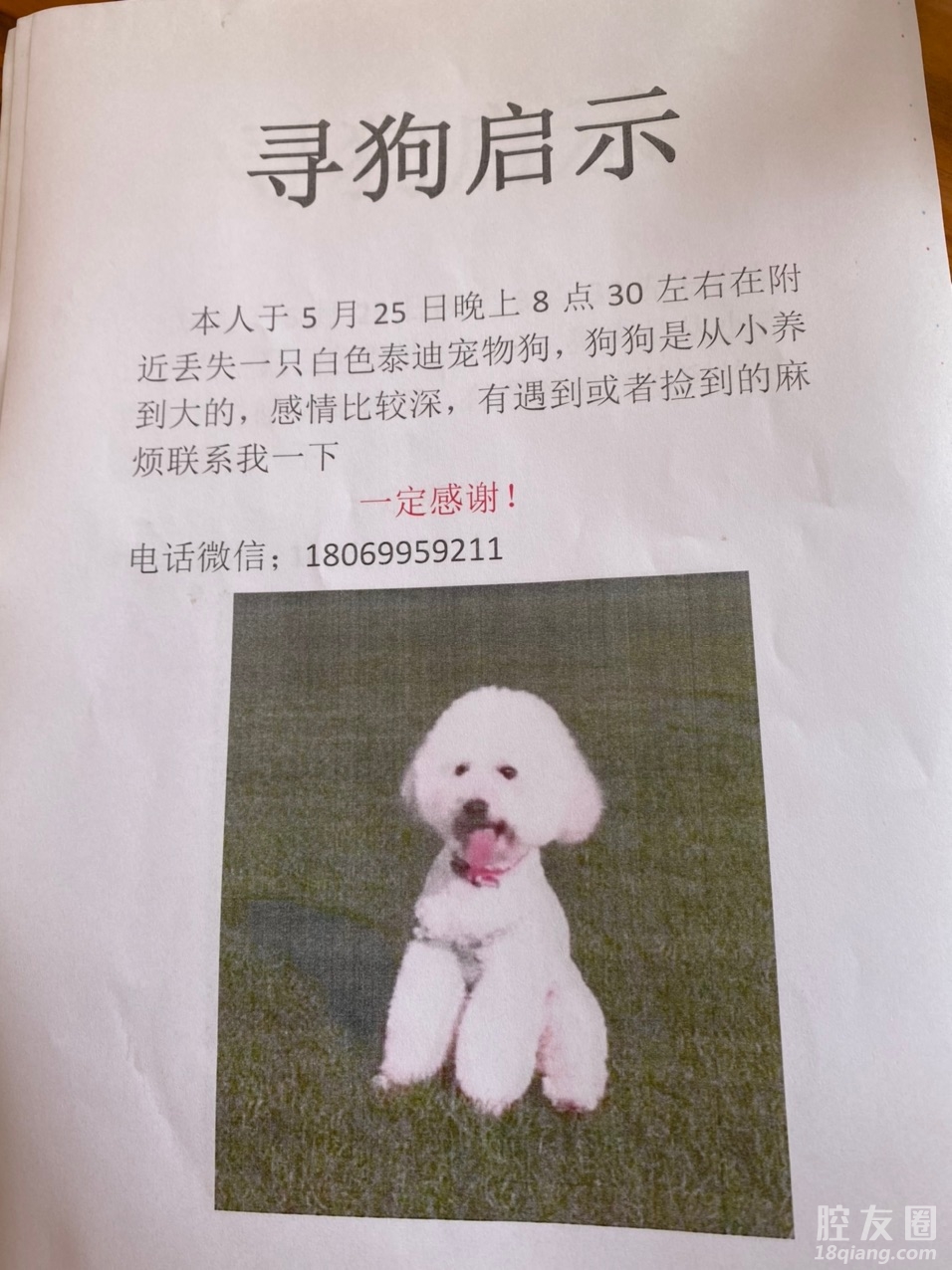 城西夏演狗狗走丢了,大家帮忙留意一下,白色的泰迪,从小养到大的,感情比较深,有遇到或者捡到的麻烦联系一下,感谢!