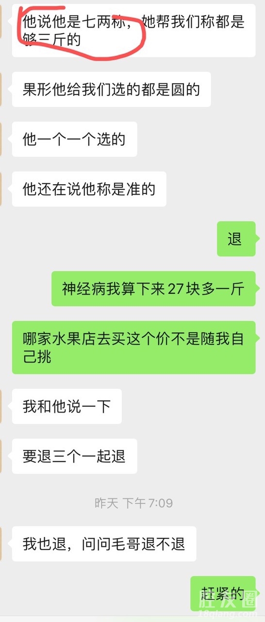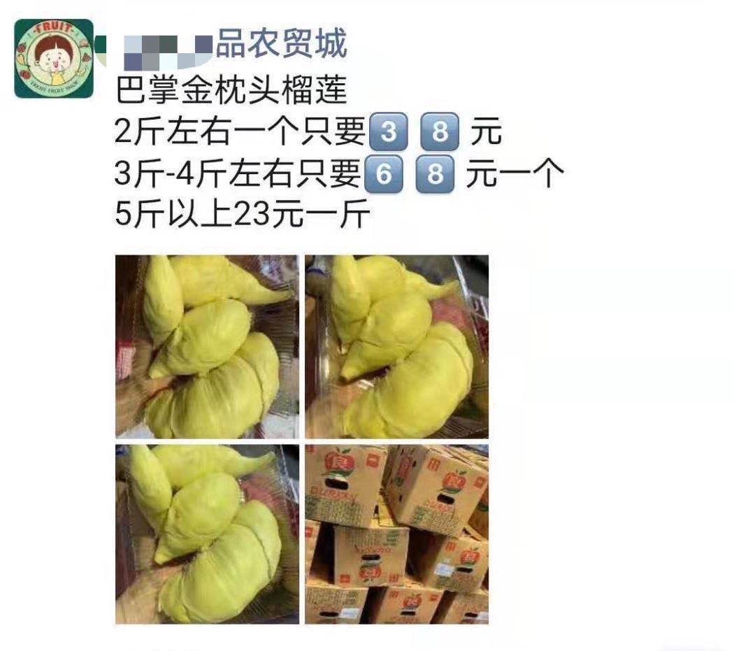 水果市场的X果果品发朋友圈卖榴莲2斤左右38/个,3-4斤68/个,和同事一起买了3个68的。结果商家说是用的七两称,实际到手每个才2斤半左右!算下来27块一斤,我随便去哪个水果店买买都不要这个价!