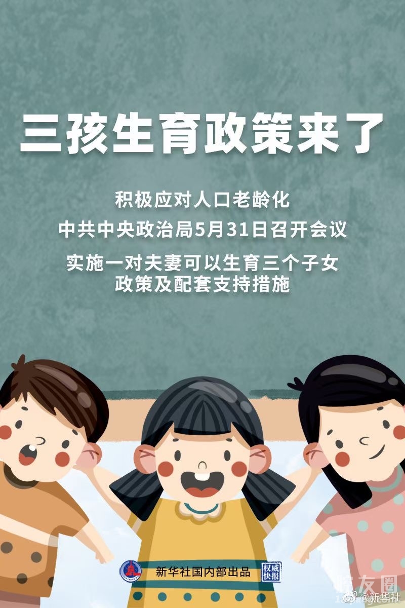 积极应对人口老龄化,我国将出台重大政策举措。中共中央政治局5月31日召开会议,会议指出,进一步优化生育政策,实施#一对夫妻可以生育三个子女#政策及配套支持措施,有利于改善我国人口结构、落实积极应对人口老龄化国家战略、保持我国人力资源禀赋优势。