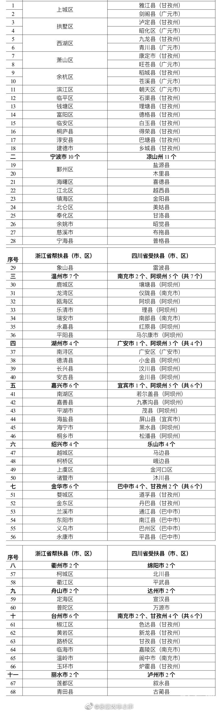 台州市6个县区结对南充市2个县和甘孜州4个县;