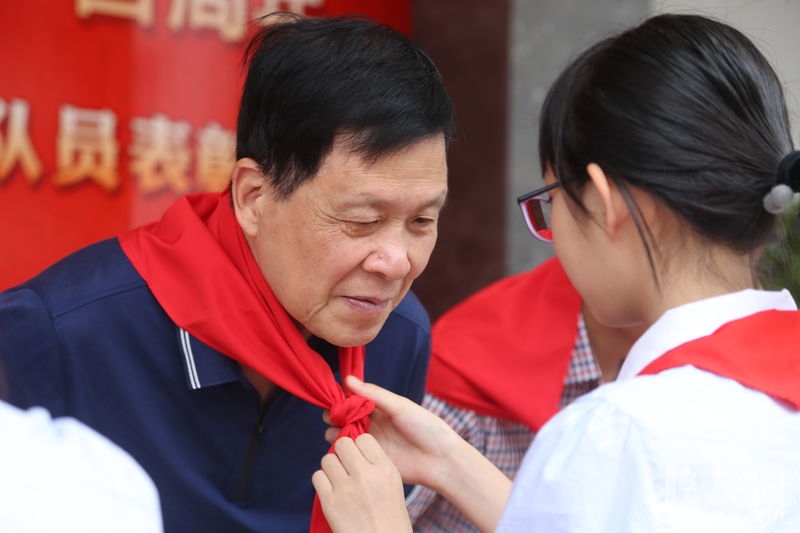 今天上午,在市区环城小学,72岁的刘世玉快乐得像个孩子,特别是当少先队员为他系上红领巾的那一刻。当天,环小举行刘世玉奖学金发放仪式,“新时代好少年”“十大暖心少年”“十佳少先队员”“十大小运动员”等120名孩子上台领奖并和刘世玉合影留念。