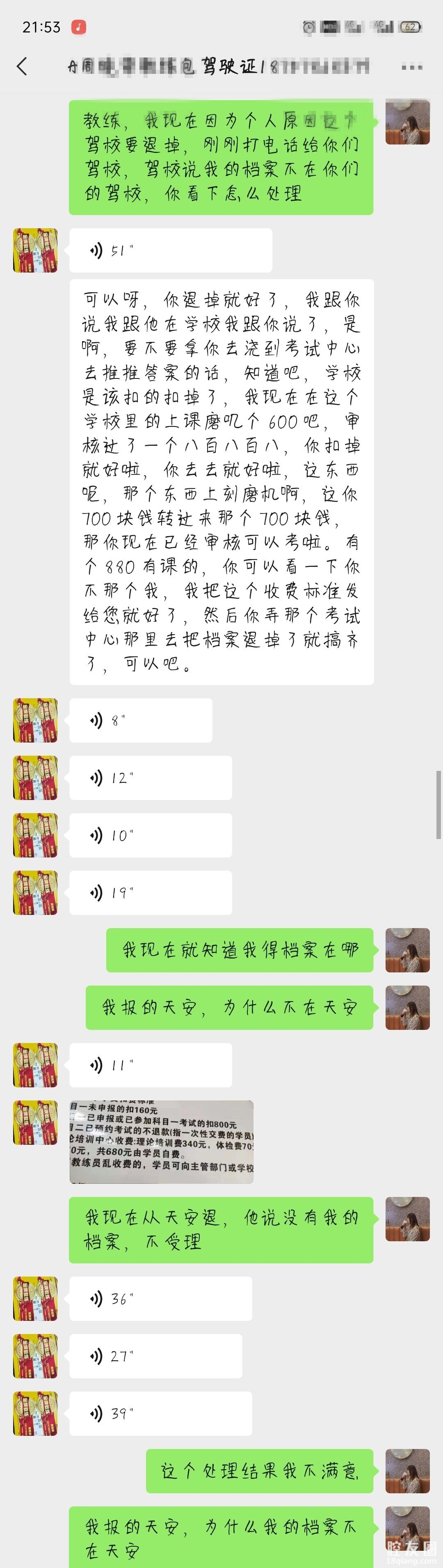 然后就闹了很不愉快,我说我要退学,找教练要天安驾校的电话,教练含糊其辞不给还说了一堆,后面我就其他渠道找到了电话打过去,这个时候可笑的事情发生了,我在天安驾校报的驾校。我得档案竟然不在天安,打运管局电话,运管局查到我的档案在金华的一个听都没听过的驾校,我得第一反应就是教练欺诈学员。外报学员,我跟运管局反应,诉求全额退学费,运管局竟然说管不了,找教练解决,教练说要扣钱,本来就是欺诈学员,为什么还要扣掉我得一半学费,我觉得很过分,但是教练态度很坚决,一直也不解决,这让我们这种第一次学驾驶的学员心理怎么承受得了,我觉得很过分。