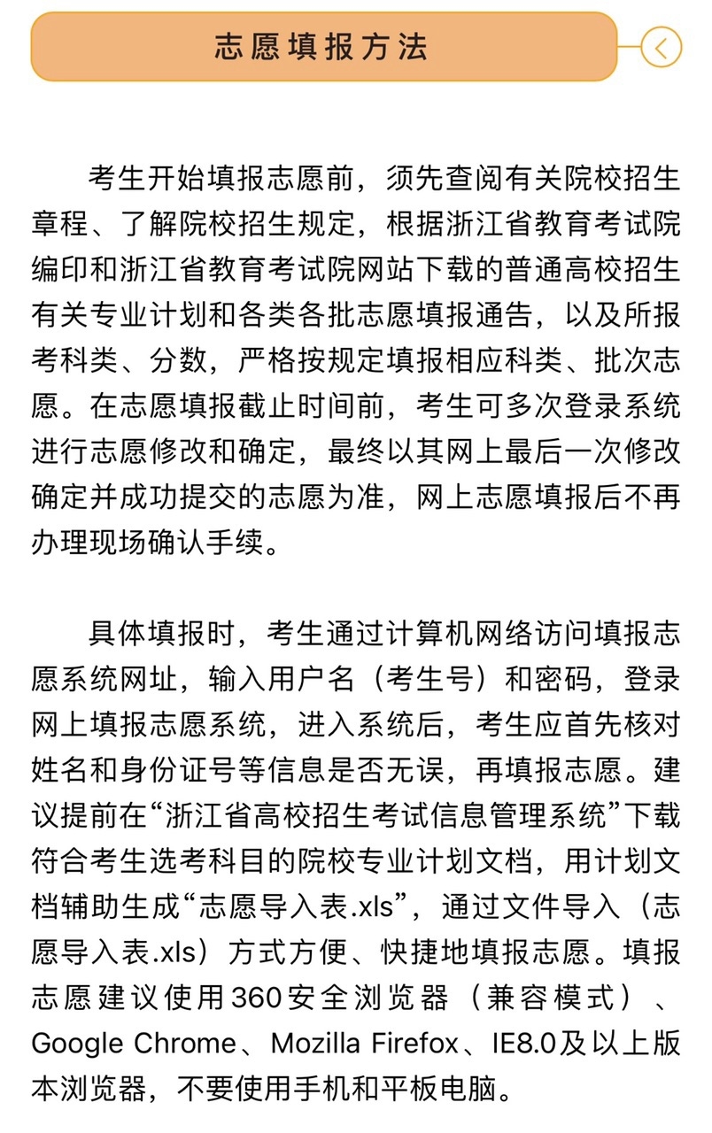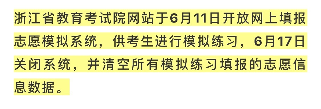 浙江省教育考试院网站于6月11日开放网上填报志愿模拟系统,供考生进行模拟练习,6月17日关闭系统,并清空所有模拟练习填报的志愿信息数据。