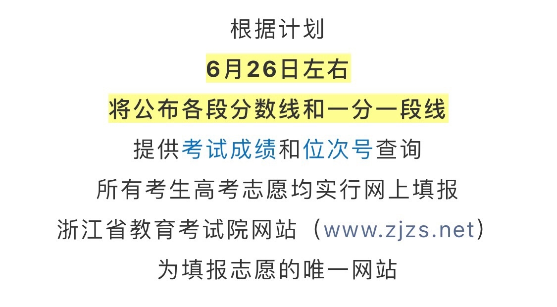 根据计划,6月26日左右将公布各段分数线和一分一段线,提供考试成绩和位次号查询。所有考生高考志愿均实行网上填报,浙江省教育考试院网站(www.zjzs.net)为填报志愿的唯一网站
