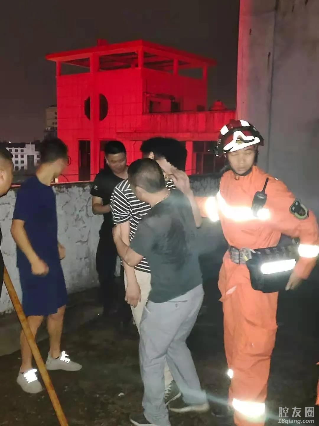 (身着黑色短袖的为金智斌)在场众人见金智斌将人拽回,一起上前帮忙将人拉了上来,同时检查了一下该名男子身体情况,身上并无外伤,只是人已经脱力。之后金智斌与其他人一同将该男子背下楼,交给家属带回安抚照顾。