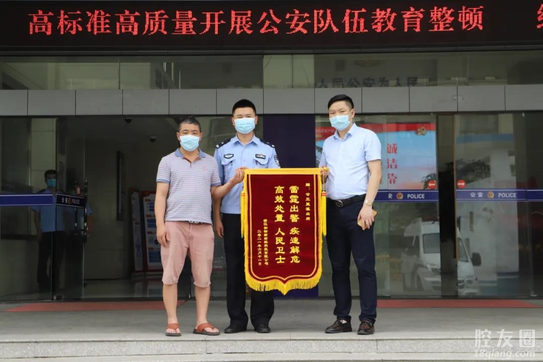 6月15日下午,男子的父亲苏先生携了一面书写着“雷霆出警 疾速解危 高效处置 人民卫士 ”锦旗来到了廿三里派出所,特地感谢金智斌当天救助其儿子的英勇行为。