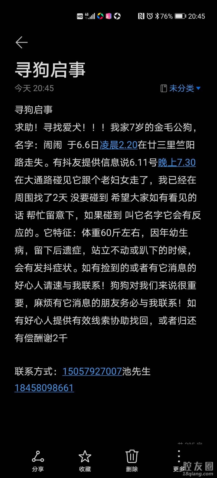 求助!寻找爱犬!!!我家7岁的金毛公狗,名字:闹闹  于6.6日凌晨2.20在廿三里竺阳路走失。有抖友提供信息说6.11号晚上7.30在大通路碰见它跟个老妇女走了,我已经在周围找了2天 没要碰到 希望大家如有看见的话 帮忙留意下,如果碰到 叫它名字它会有反应的。它特征:体重60斤左右,因年幼生病,留下后遗症,站立不动或趴下的时候,会有发抖症状。如有捡到的或者有它消息的好心人请速与我联系!狗狗对我们来说很重要,麻烦有它消息的朋友务必与我联系!如有好心人提供有效线索协助找回,或者归还有偿酬谢2千