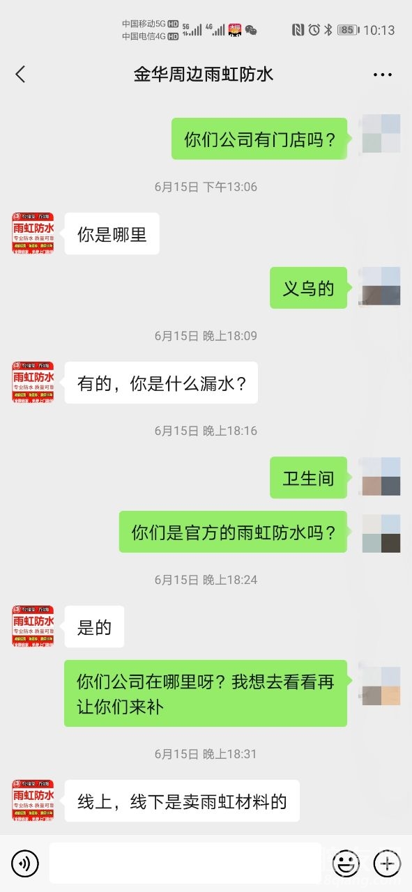 先简单说一下事情概况,骗子会在抖音,58同城,淘宝等发布广告信息,本人就是在抖音中上当,冒充正规厂家雨虹防水补漏,宣称不敲砖灌胶补漏,质保十年。有400号码,工作人员穿着雨虹衣服,用的胶上有雨虹信息(后向正规东方雨虹证实均为仿冒)。跟所有平台上受骗的套路一样,先不说价格,一顿操作100多斤,58一斤,先不说天价补漏钱补漏效果达不到,还导致我家下水管道堵塞。