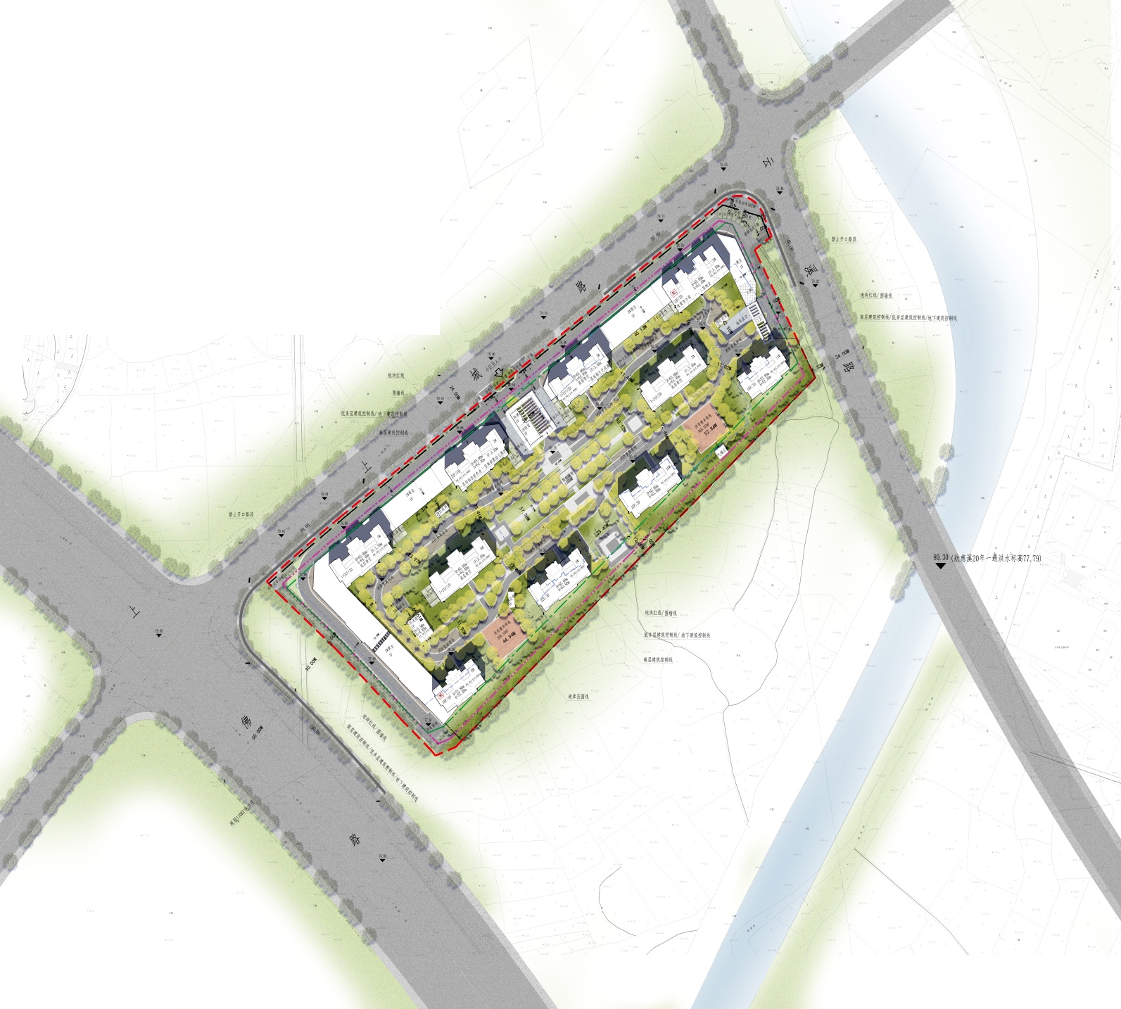 住宅区总户数819户,10栋高层住宅和商业、配套用房组成。小区出入口位于上城路南侧,设置2个地库出入口,靠云溪路侧还设有地库出口。