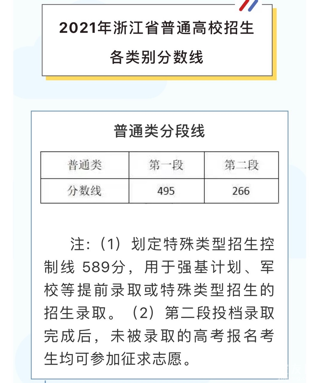 2021浙江高考分数线发布!普通类一段线495分 二段线266分