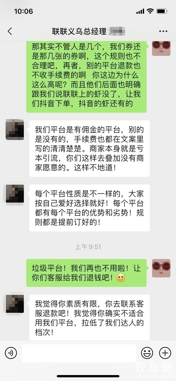 事情是这样的,昨天下班我和朋友在联联上下单了三张龙虾券(一人下了一单),结果到店,被告知,联联的龙虾没了,抖音的虾有,且三人不能使用优惠券(但是如果是三个陌生人来是可以使用三张券的)。我们后面只能抖音重新下单,打算退了联联的券,结果联联客服一直联系不上,加了联联的总经理的微信,跟她反映了这个事情,结果惨遭辱骂拉黑,说我们配不上联联!好家伙,联联这么高大上的,不是我们寻常百姓消费的了的