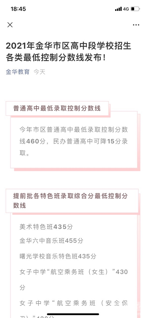 2021年金华市区高中段学校招生各类最低控制分数线发布!