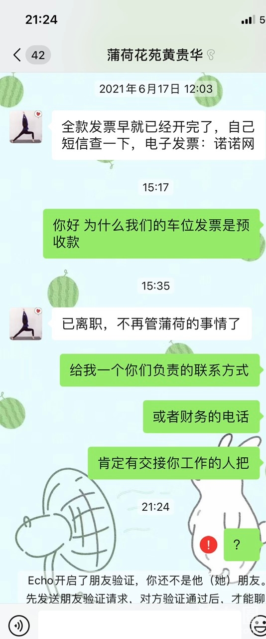 2.中间销售主动联系我,基本都是交钱的事情,发票到位几号发了发票一概不通知。今天我从邻居那里听说之前给我们的车位发票都是“预售款”,这一点肯定存在问题的,所以发了微信问销售,销售回复“已离职,不再管蒲荷的事情”,我问财务电话或者交接人联系方式发我一个。(自认为我的问题没有问题吧,你走了,我们的事情还没完全结束,不不愿意服务客户了,至少给一个交接人电话),等了一天没有回复,我再发消息询问,提示我被删除。