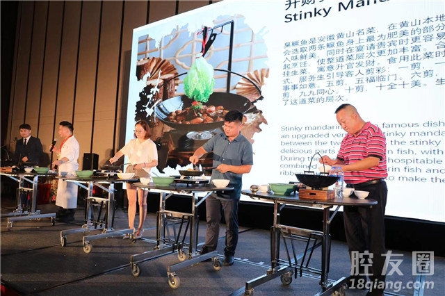 臭鳜鱼是安徽的一道名菜,选取两条鳜鱼身上最为肥美鲜嫩的部分,先改刀再进行腌制,使鱼肉更加入味鲜美,洪师傅发挥奇思妙想,在臭鳜鱼上方悬挂生菜,寓意升官发财。