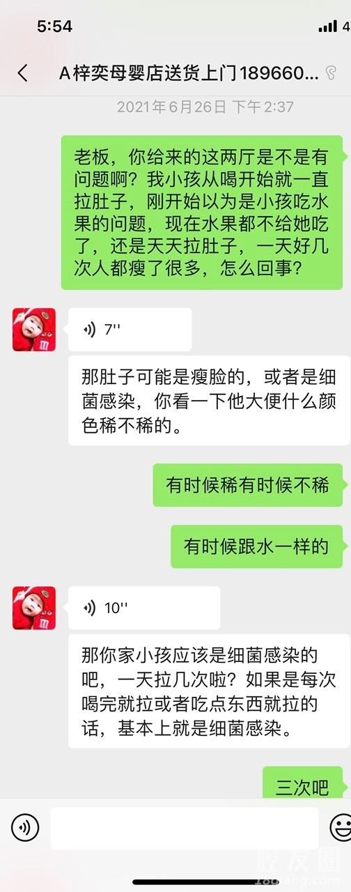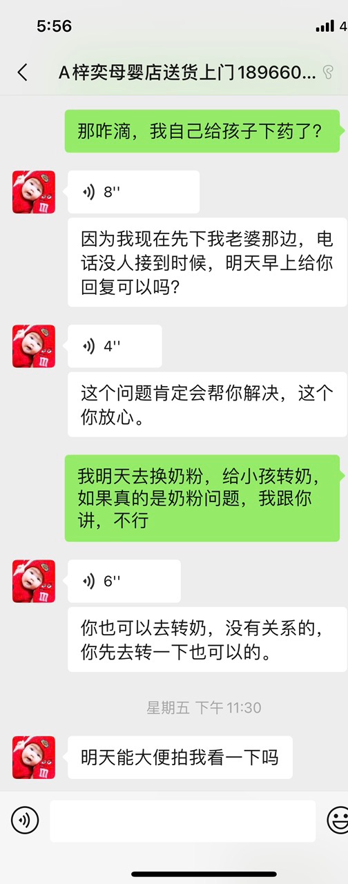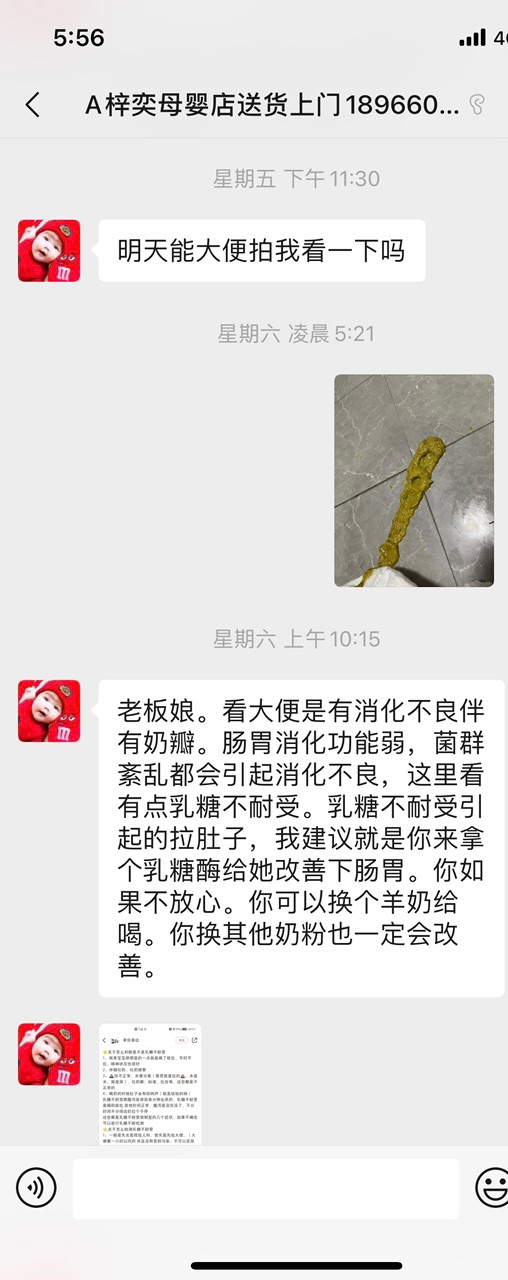 当天我就拿了一厅大的,和一厅小的,就从这一厅小厅的开始,我小孩从开始喝,发现了奶粉起坨,化不开,然后联系老板,老板说奶粉没有问题,然后让我拿去店里换,那时候小厅的就没有喝了,开始喝大厅的,后来小孩就一直拉肚子,拉肚子有好几天了,我们以为是小孩水果吃去的问题引起的,给小孩的水果停了,一周没有吃水果,小孩的大便情况还是没有好转。