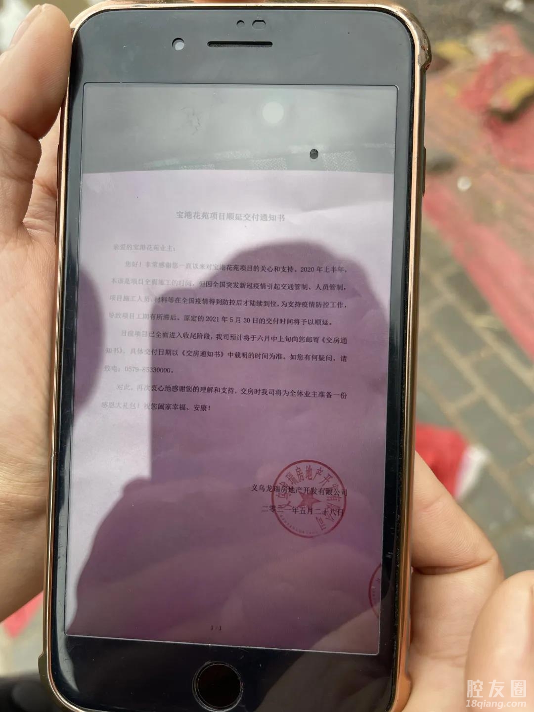 据了解,宝港花苑位于义乌城西街道,系宝龙地产开发的商品房项目。根据合同约定,部分业主的房屋在3月30日前交付,其余业主的房屋在5月30日前交付。然而,3月30日,宝龙却声称受疫情影响,房屋统一在5月30日前交付。5月30日,业主们如期前去收房,却被告知5月28日已向他们寄送顺延交付通知书,双方在项目售楼处僵持不下。