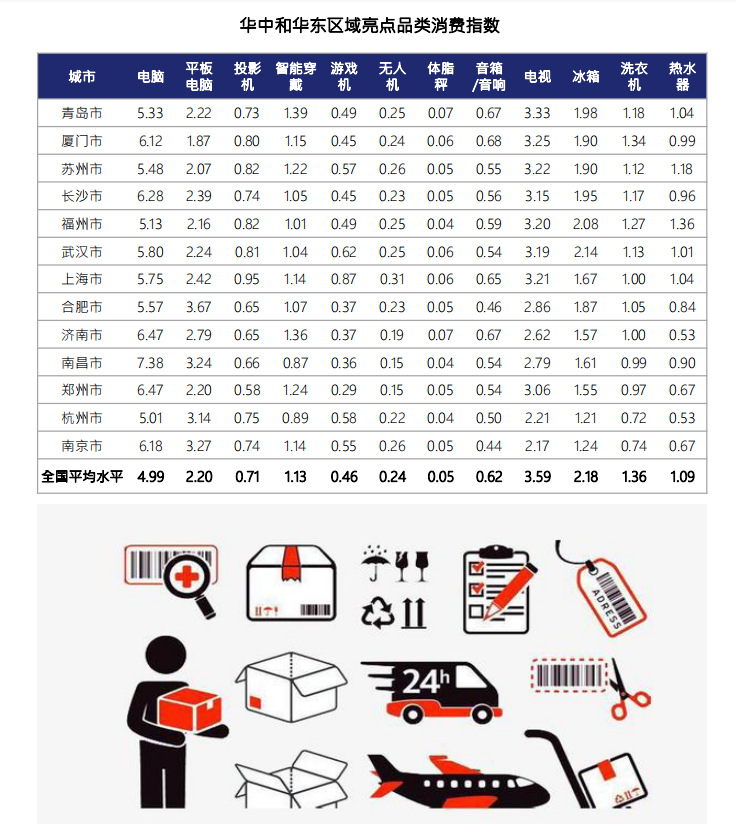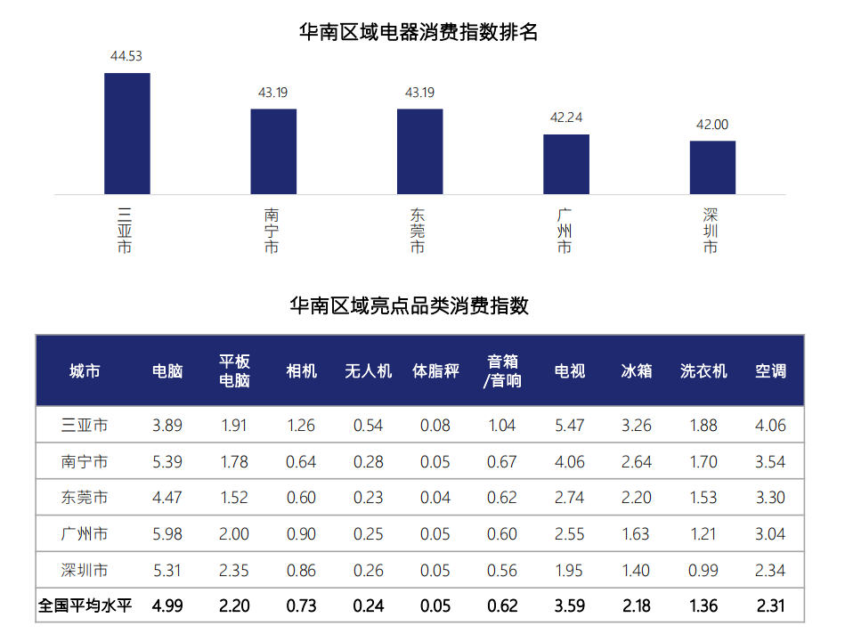 在细分品类,空调品类消费指数高于全国平均值,可能与南方普遍气温高有关;电脑品类消费指数也高于全国平均值,可能是华南城市经济发展快,电脑作为工作上必不可少的工具,用于提升效率,其使用率和普及率均比较高。