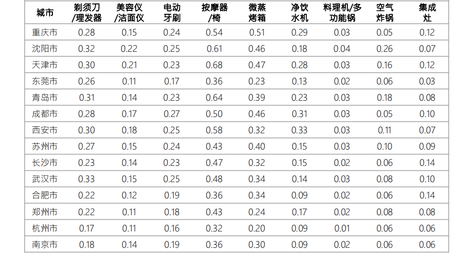 在消费升级大背景下,电器消费需求是多样化的。某些单品类的消费指数,可以从侧面体现中国用户消费升级的轨迹。因此,接下来,将针对单个品类在各城市的得分进行分析。单品类消费指数可展现消费者对该品类的重视度,以及实际消费情况。单品类消费指数高,说明该城市消费者对该品类既重视又消费较多。