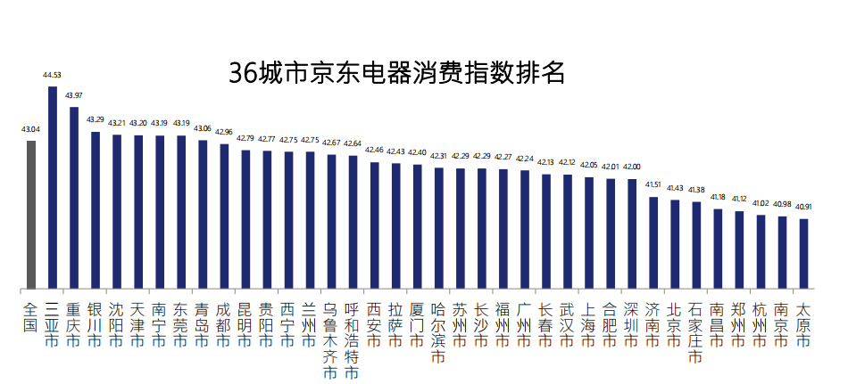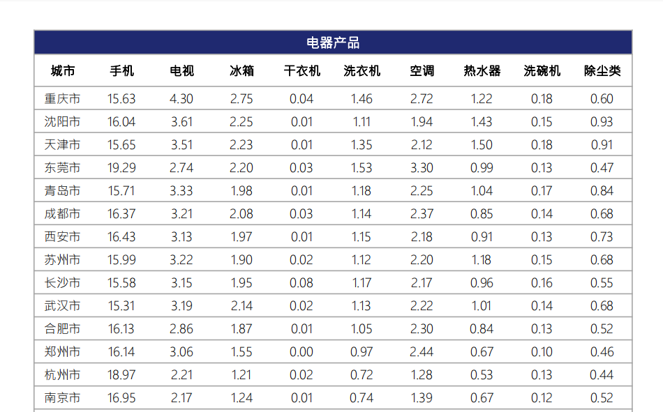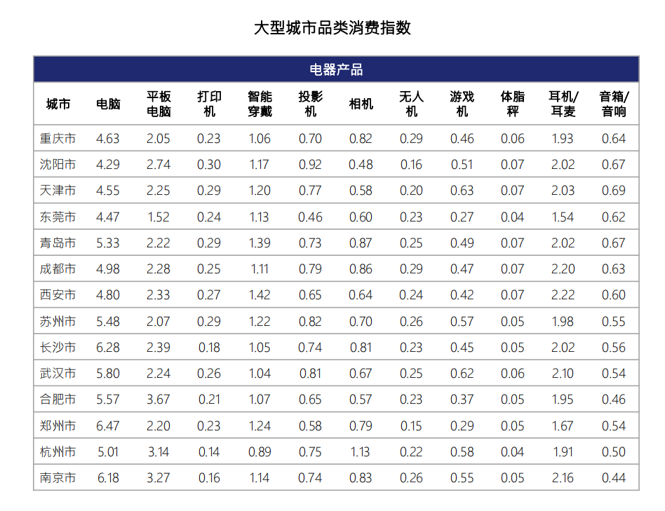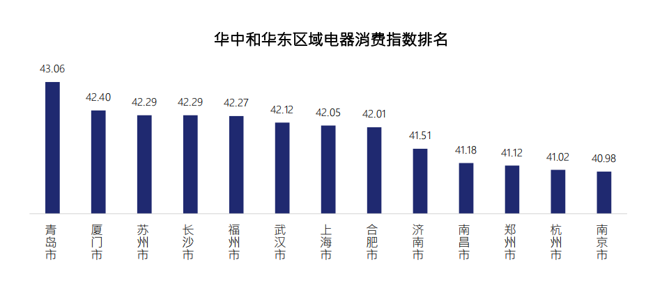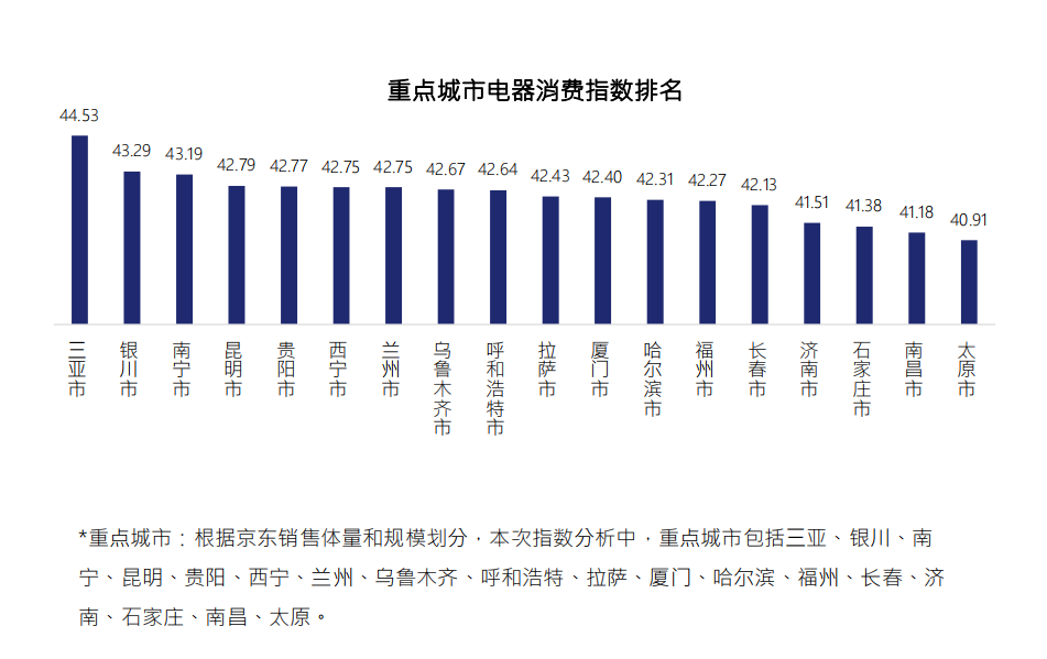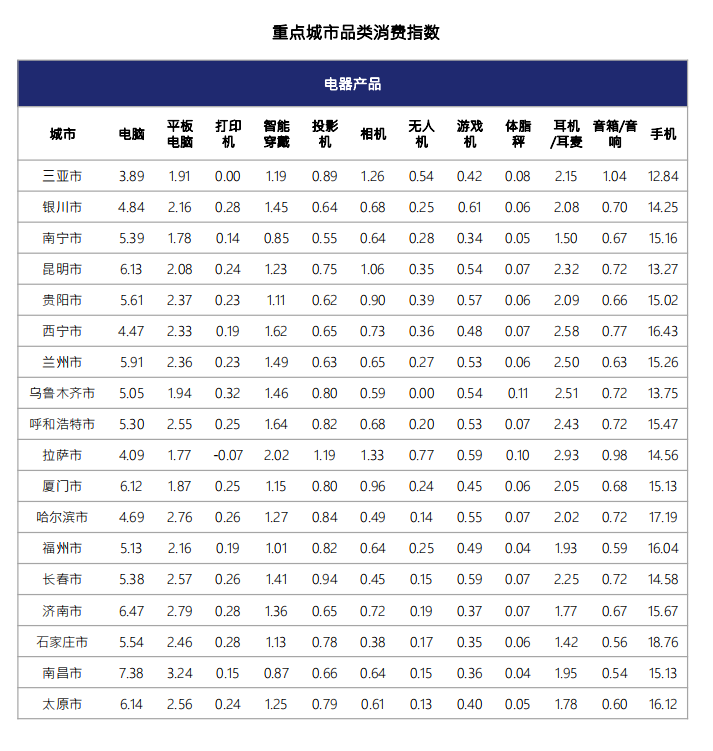 重点城市电器消费指数整体中等偏上,说明消费者更注重电器的享受型消费,更多是为享受生活闲暇。