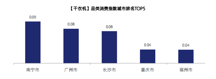 南方城市干衣机品类消费指数较高,这也符合人们的地域认知,南方湿润,而且梅雨季节到来后阴雨天也多,“潮湿”的南方人,南方城市普遍最爱购买干衣机。由于消费不断升级,人们更关注衣物的除菌消毒,消费者更看重舒适体验,因而拥有除菌和干衣功能的干衣机等消费升级类电器受到消费者青睐。