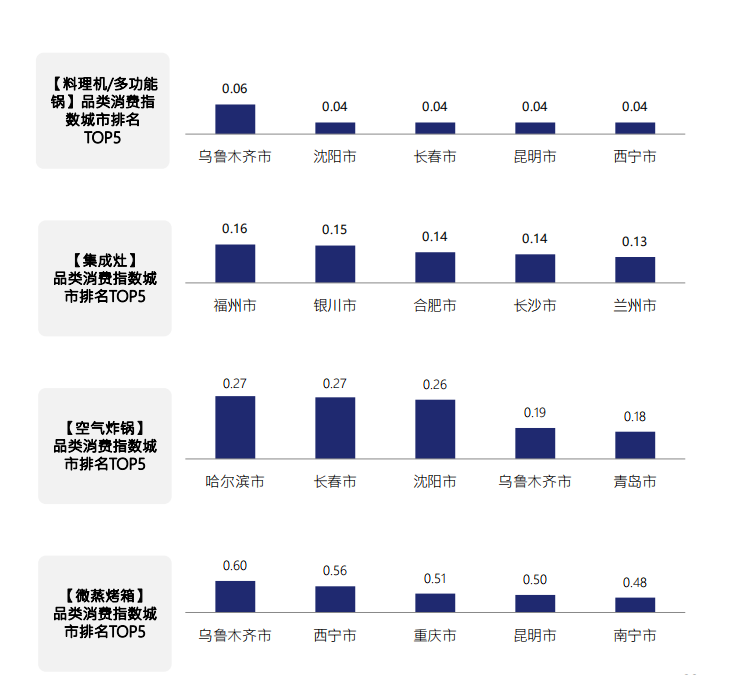 2020年以来居家、厨房消费场景增长,使料理机/多功能锅、集成灶等厨电品类在各城市基本都有相同需求,同时空气炸锅、微蒸烤箱等产品作为新型厨电品类消费指数分数较高,说明消费者对“健康饮食”、“多样化饮食”的关注度在持续提升,美好生活的根本需求正在行业中掀起一场深刻变革。