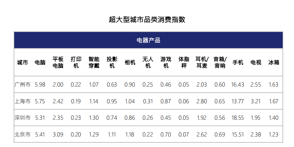 北上广深电器消费指数从高到低依次为广州、上海、深圳、北京。相对而言,广州人在选购电器时更偏向于电器带来的享受,比如耳机/耳麦、洗碗机、无人机等产品;而北京节奏更快,更偏向于电器带来的效率提升,比如电脑、平板电脑、投影机等。