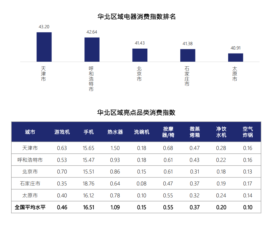 华北城市中,天津电器消费指数高出北京较多。天津作为海滨城市,生活上偏休闲和享受,电器消费更倾向于享受型。