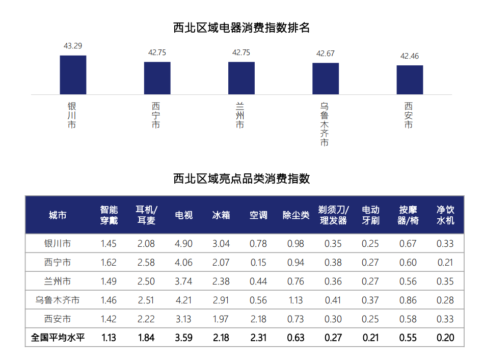 近年国家大力开发西部,带动西部人民整体生活水平持续提升,并推动了消费升级。比如:在细分品类上,智能穿戴品类消费指数西北地区平均值(1.48)要高于全国平均值(1.13),耳机/耳麦、冰箱、电视、按摩椅等产品都倾向于享受型消费,但由于地理原因,比如西宁属高原大陆性气候,空调的需求度似乎低于较炎热的地区。