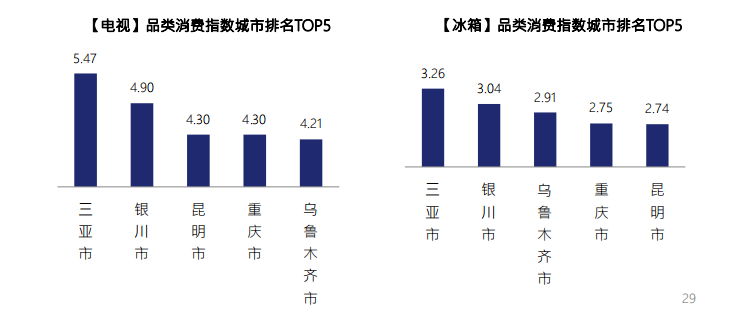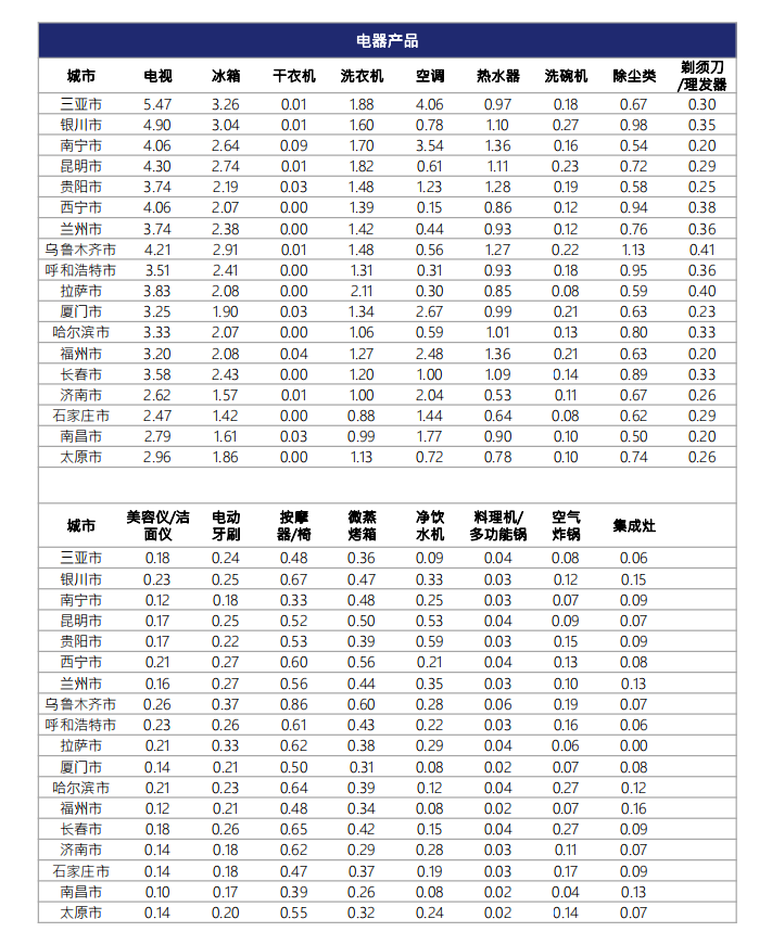 中西部电视和冰箱品类消费指数高。三亚、银川、昆明、重庆、乌鲁木齐等城市的电视(4.64分)和冰箱(2.94分)品类消费指数均值高于全国平均分,相比于发达地区因生活快节奏而没有时间去享受看电视乐趣,以及制作美食的快乐,中西部这几个城市可以说是最爱看电视的城市,最喜欢用冰箱的城市(如重庆,以美食文化著称的城市)。