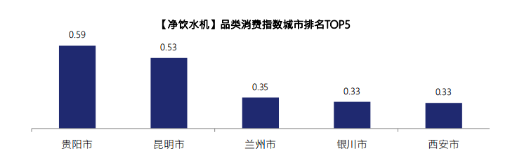 随着人们收入水平的提升、消费倾向的高涨和健康素养的增强,人们的健康意识越来越强。很多人逐渐开始将健康安全饮用水需求诉诸于家用净水器,家用净水器的关注度不断升温。因此如果从净饮水机消费上看,在西部较为缺水的地区(比如贵阳、昆明、兰州、银川等缺水型城市),净饮水机尤其成为民众提升居家健康和生活品质必不可少的电器之一,因此该品类消费指数的前几名多为西部城市。