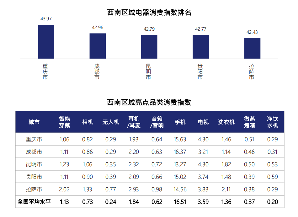 西南人民更注重生活享受,节奏比较慢,可能是在生活中不太想被手机所束缚(比如随时能被联系上、随时要处理工作等),其手机消费指数略低于全国平均值(16.51)。西藏自治区人民在智能穿戴、无人机等享受型品类的消费指数高于全国平均值较多;重庆相较于成都更偏享受,洗衣机、音响、电视等品类消费指数,重庆均高于成都。