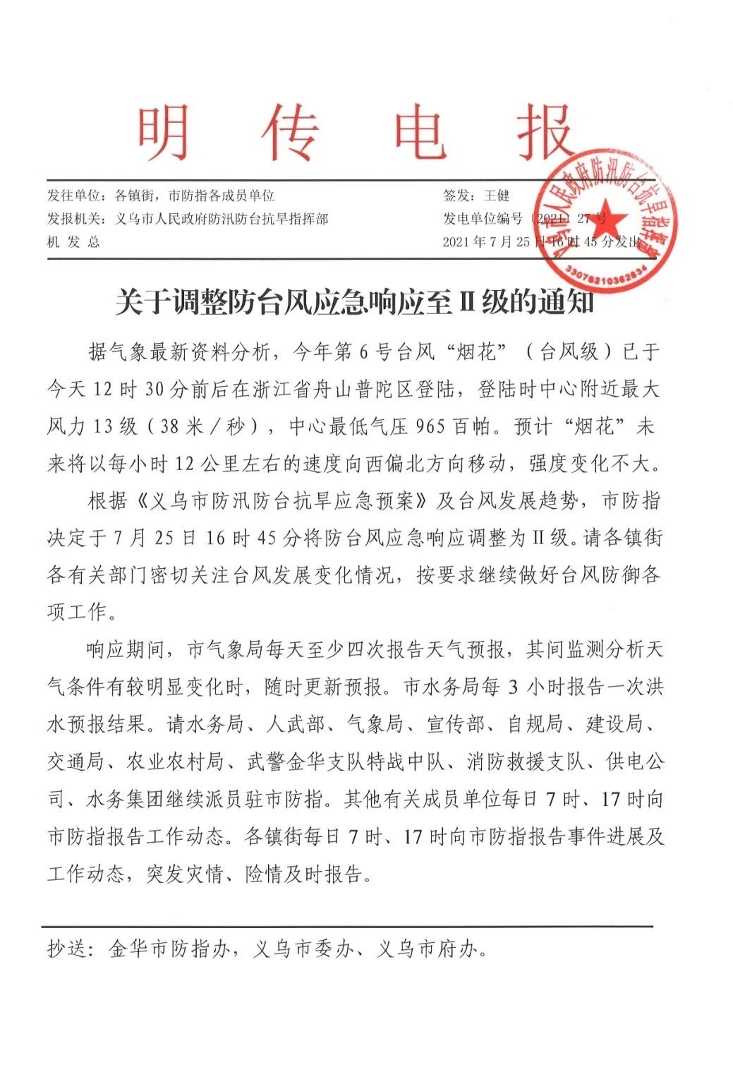 义乌防台风应急响应降至Ⅱ级