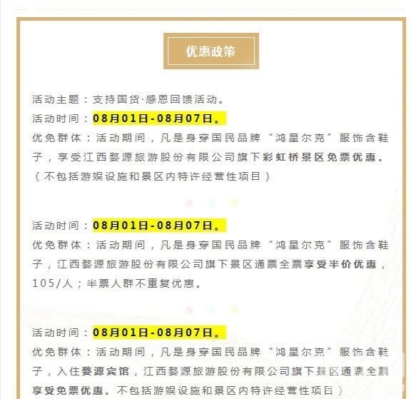 无独有偶,江西婺源旅游股份有限公司也出台了类似的活动。7月25日,该公司发布微信推文称,凭“鸿星尔克”免费游婺源景区。极目新闻记者看到,该公司为感恩支持国货品牌,举办了一起“支持国货·感恩回馈活动”。当日,婺源县旅游委员会也发文宣传了相关优惠政策。 据了解,这起优惠活动将从8月1日起正式开始,持续一周到8月7日结束。文章提到,凡是身穿国民品牌“鸿星尔克”服饰含鞋子的游客,在活动期间可享受旗下彩虹桥景区免票优惠,景区通票享受半价优惠。如果游客在游玩期间入住婺源酒店,则享受景区通票免票优惠。 “去年梅雨季节,我们彩虹桥景区的彩虹桥被洪水冲垮了。后期在修复的时候社会各界人士都很关心,很多人都出了力。”7月26日,极目新闻记者联系上江西婺源旅游股份有限公司,工作人员表示,这是公司举办的一起感恩回馈活动。一方面为了感恩国货品牌,另一方面也是感恩社会各界对彩虹桥的支持。婺源风景区官方微信公众号截图