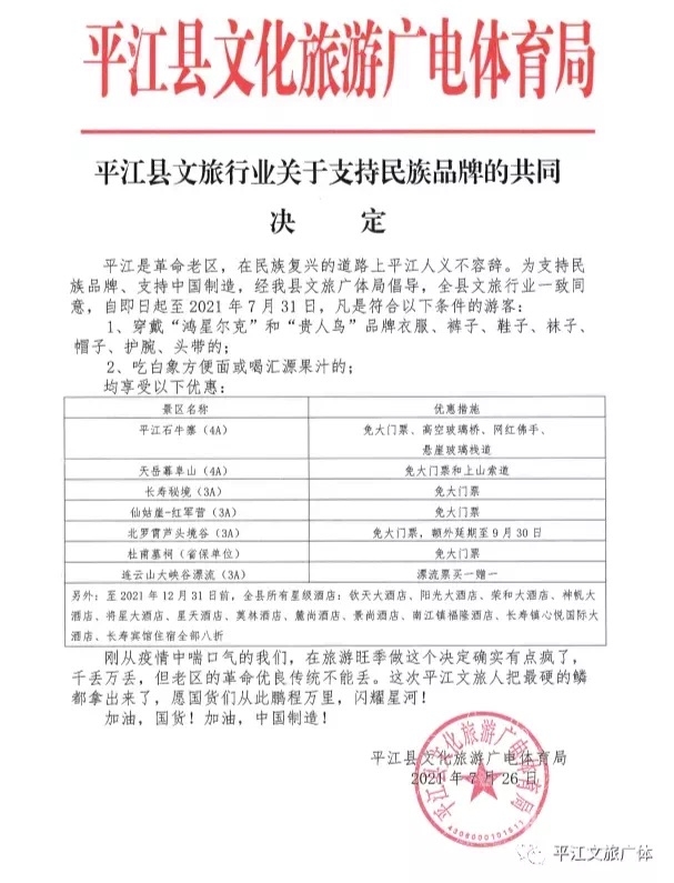 7月26日,平江县文化旅游广电体育局通过其公众号发布“平江县文旅行业关于支持民族品牌的共同决定”。在这则文件中,平江县文旅局表示,自即日起至今年7月31日,凡是穿戴鸿星尔克、贵人鸟品牌的衣服、裤子等服饰,或者吃白象方便面、喝汇源果汁的人,均可以在景区享受免门票或其它优惠。这则文件还称,符合上述条件的人,在全县12家星级酒店住宿享受八折优惠,截止时间为今年12月31日。文件中附上了提供优惠政策的景区及酒店名单。 26日中午,极目新闻记者向其中几家公司进行了求证。长寿秘境、“仙姑崖-红军营”等景区的工作人员经核实后告诉记者,景区确实有上述优惠政策,并且具体细节会与文旅局的文件保持一致。不过,名单上一家酒店的工作人员明确表示,店内暂时没有接到相关通知。 平江县文旅局在文件中表示,平江是革命老区,该政策是“为支持民族品牌、支持中国制造。”同时,文件末尾部分称:“愿国货们从此鹏程万里,闪耀星河!” 江西14景区感恩国货品牌