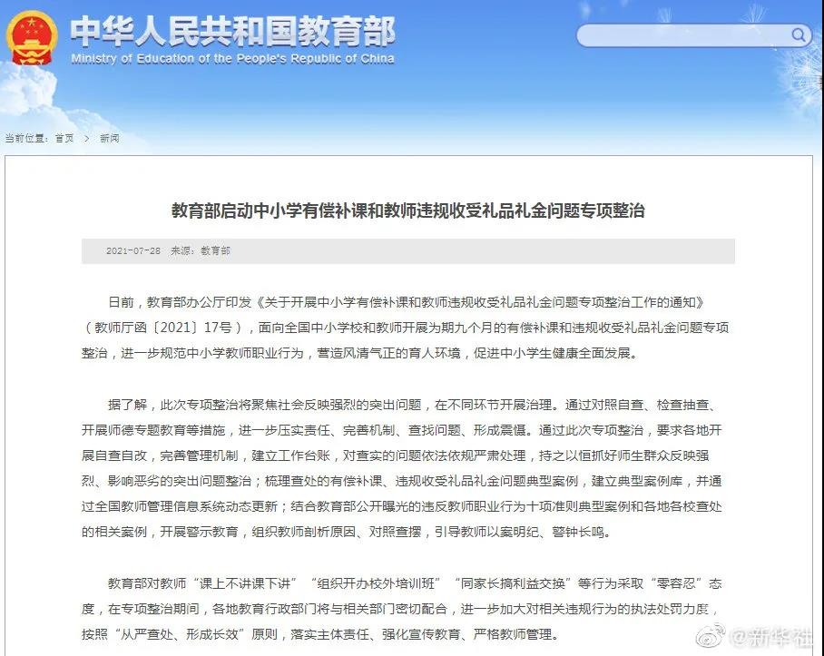 教育部对教师“课上不讲课下讲”“组织开办校外培训班”“同家长搞利益交换”等行为采取“零容忍”态度。
