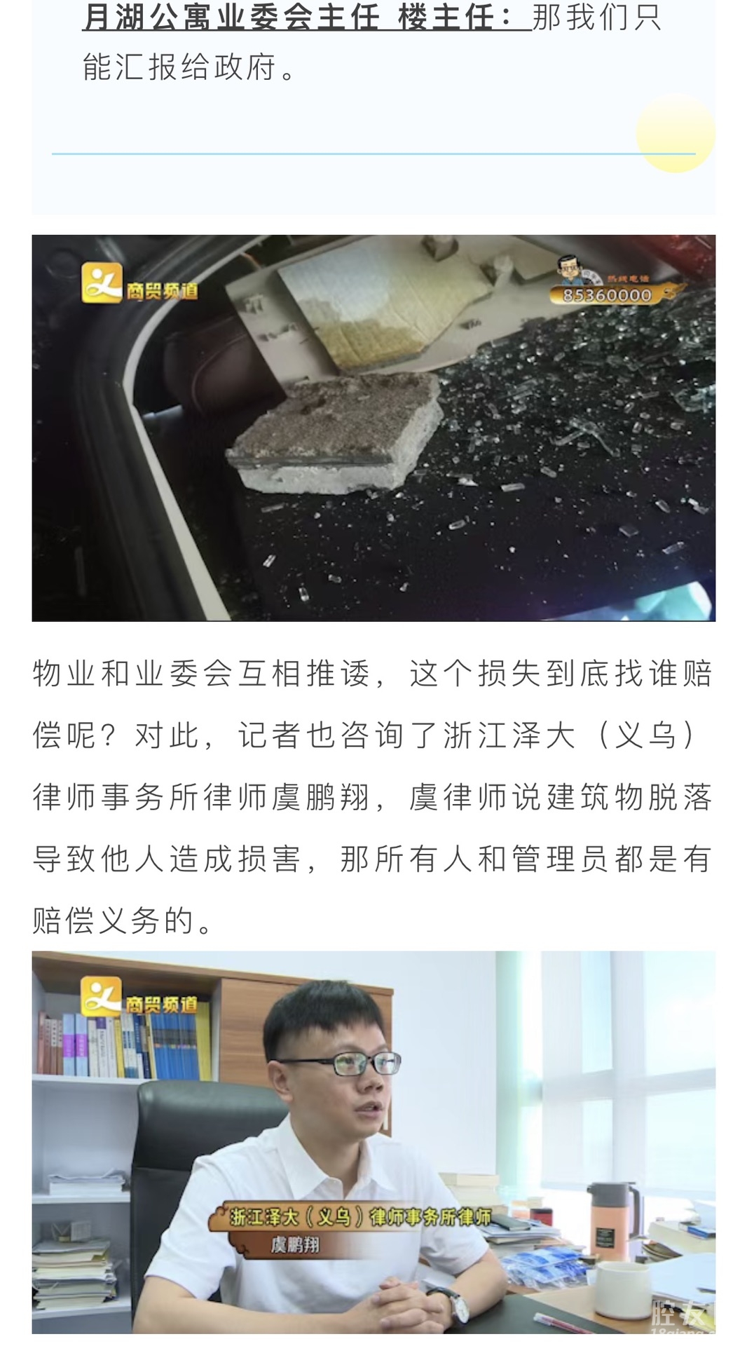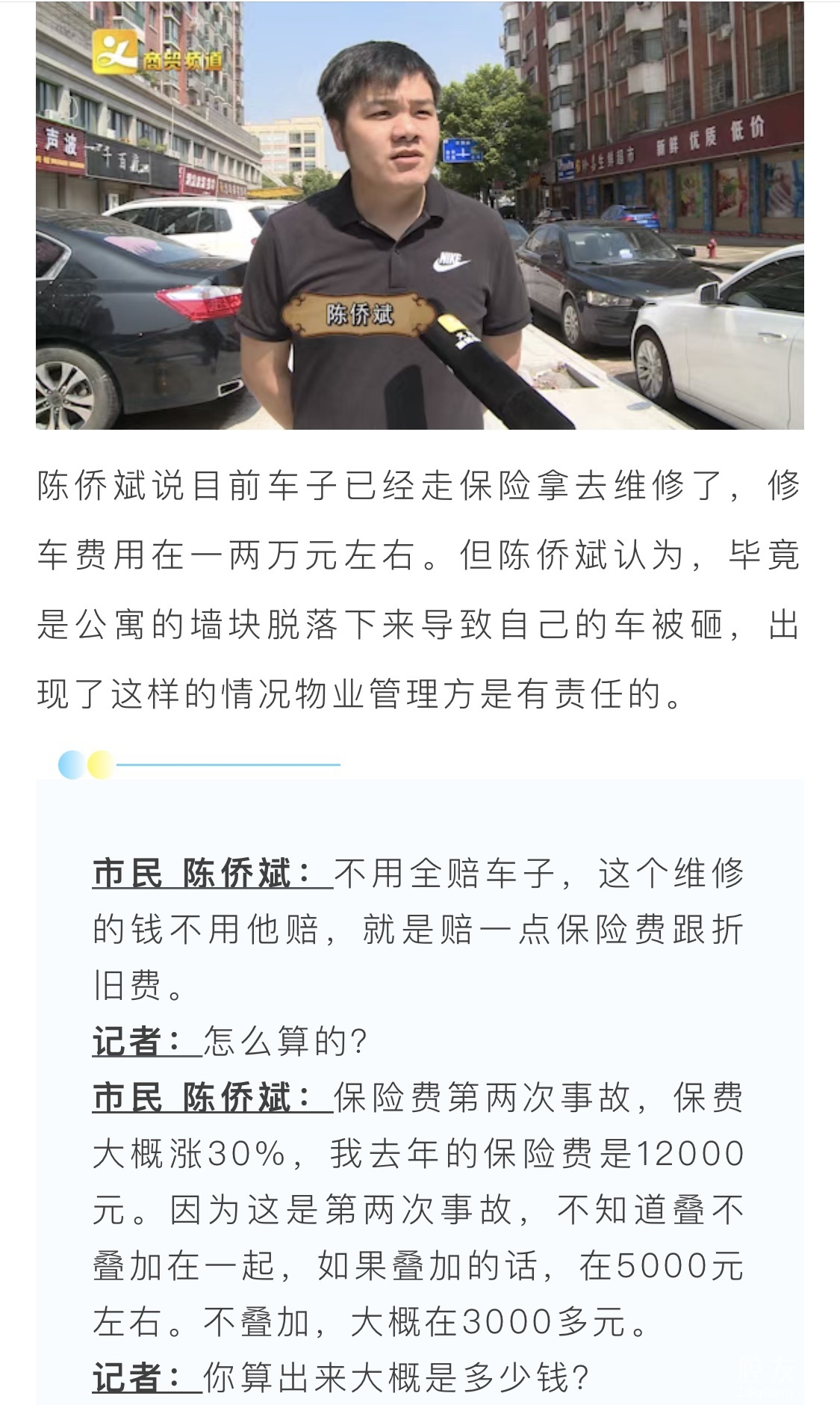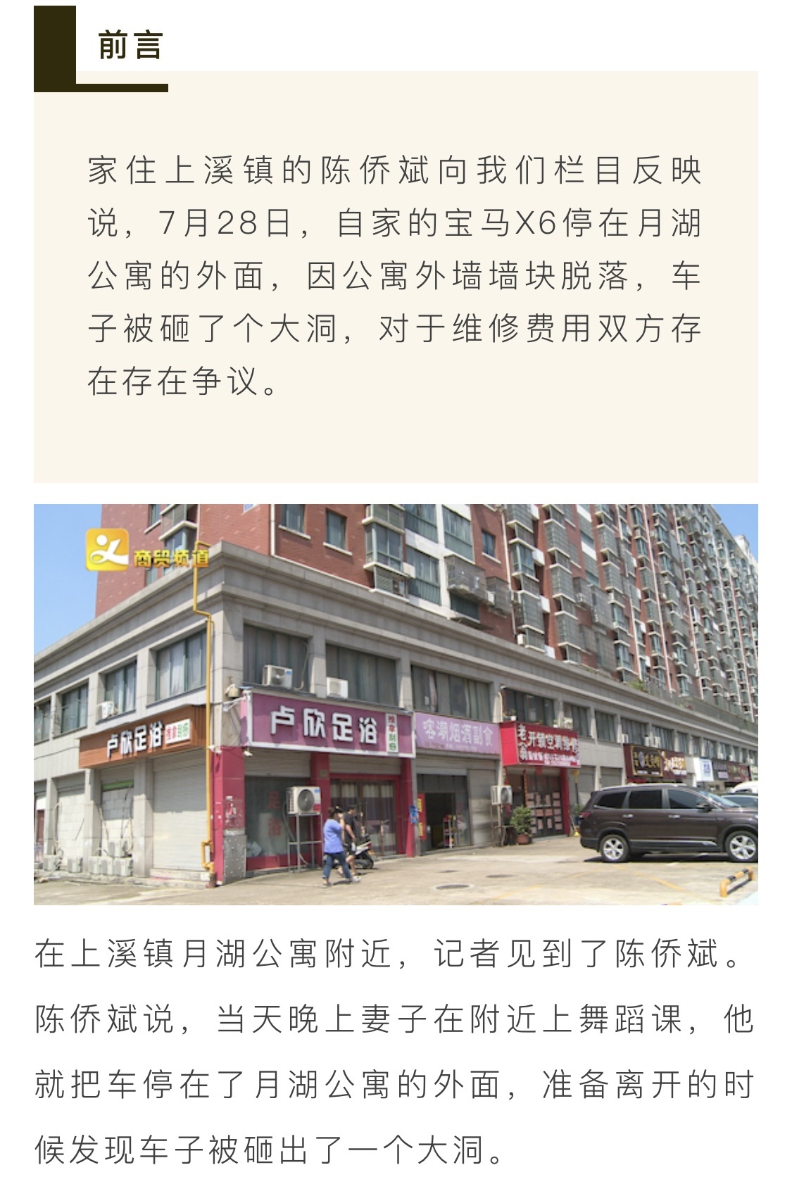 [义乌故事]上溪一公寓外墙脱落,砸中宝马!车主索赔……业委会:没钱!自己走保险! [复制链接]