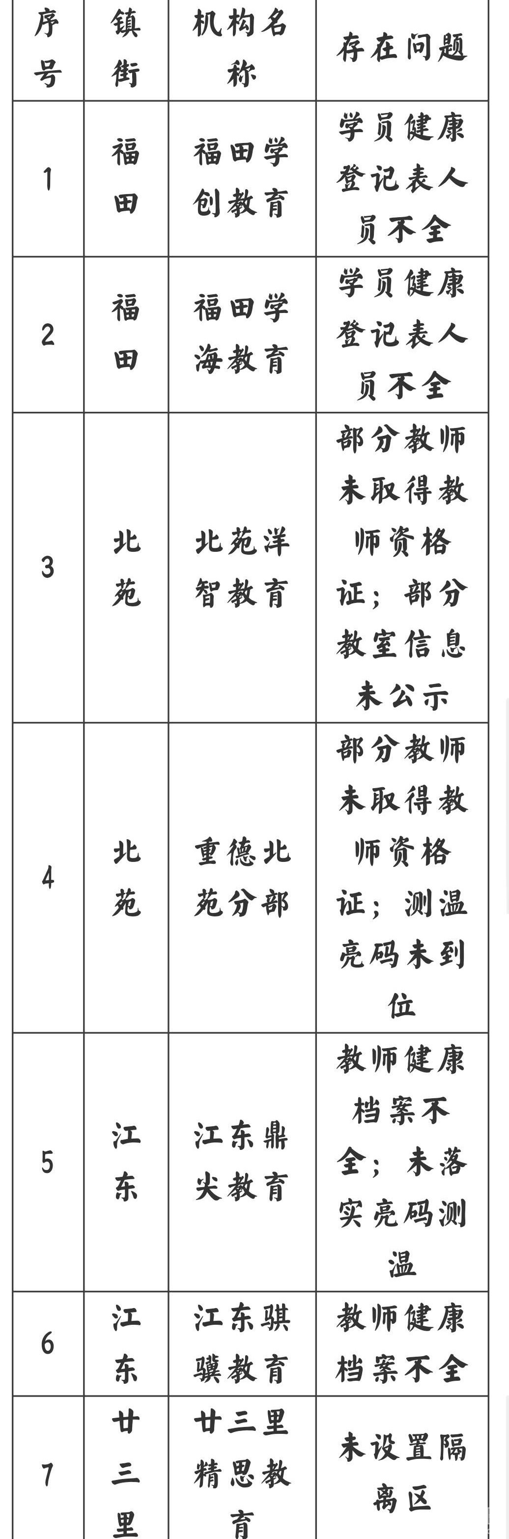 8月2日,市教育局疫情防控督查组对6个镇街的35家校外培训机构开展疫情防控专项督查,发现其中7家单位存在各类问题共10个,有关情况通报如下: