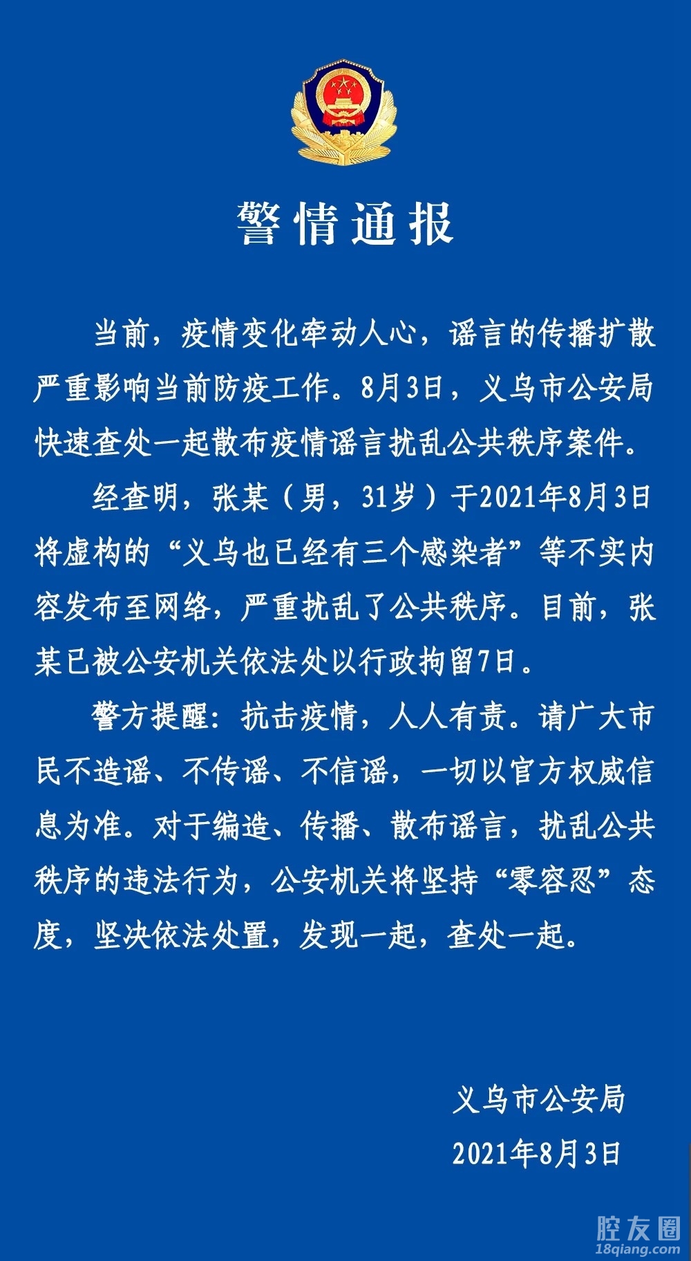 警情通报:义乌一男子散布疫情谣言,被拘留!