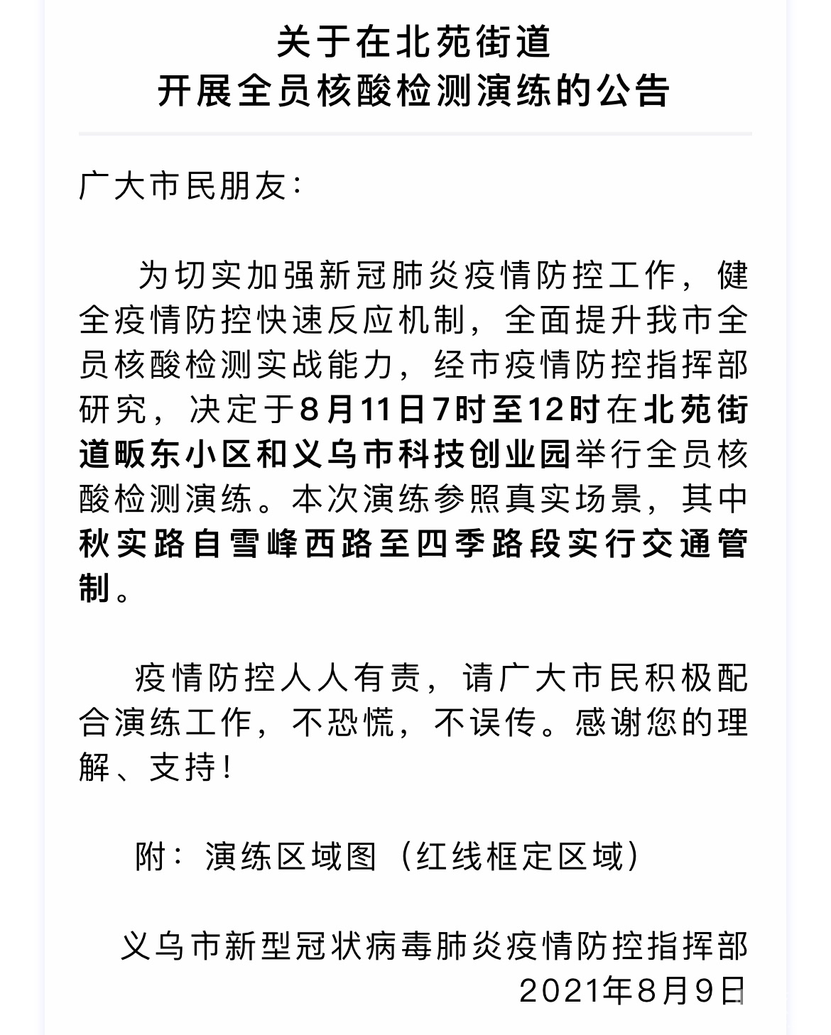 [义乌故事]关于在北苑街道开展全员核酸检测演练的公告 [复制链接]