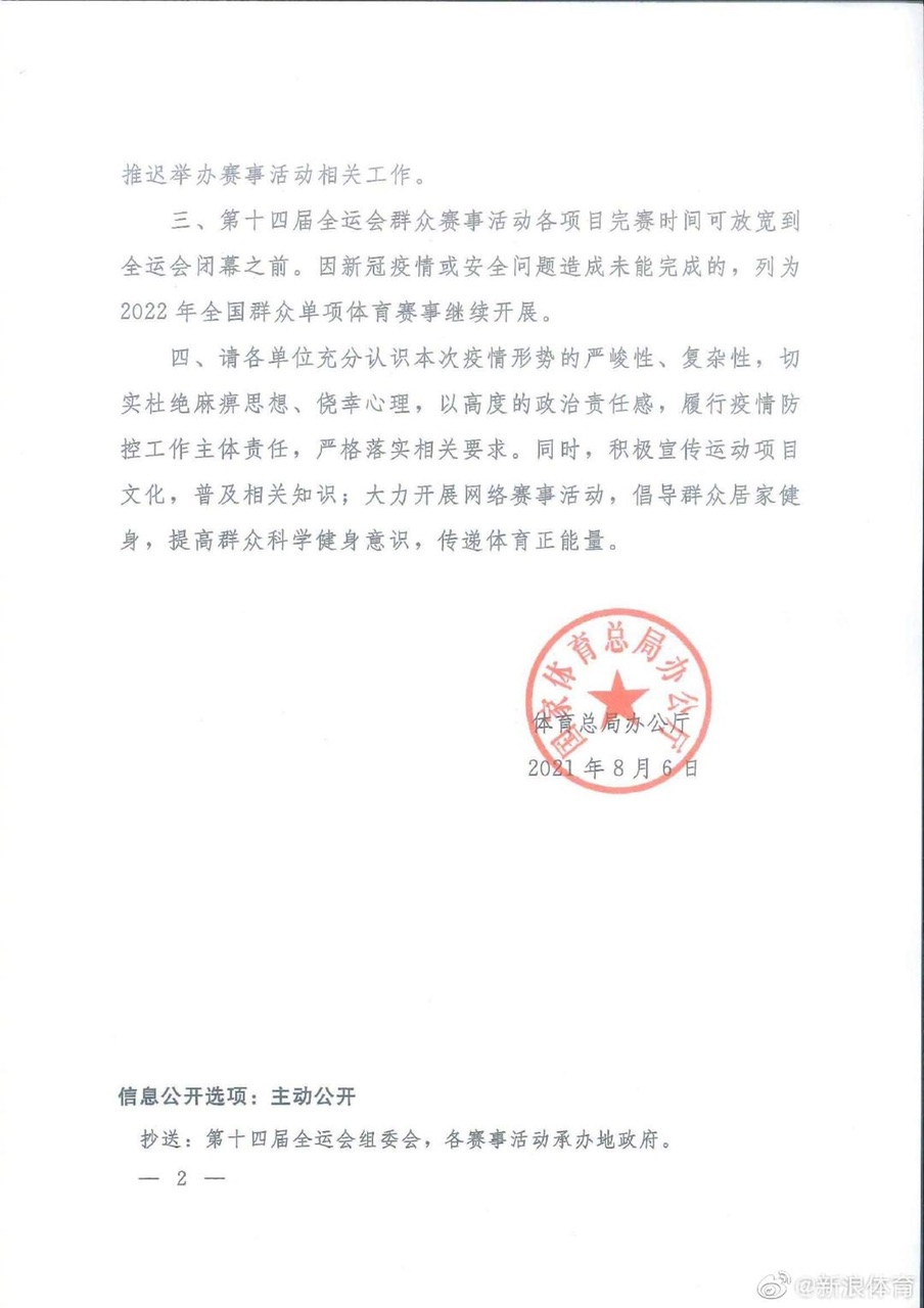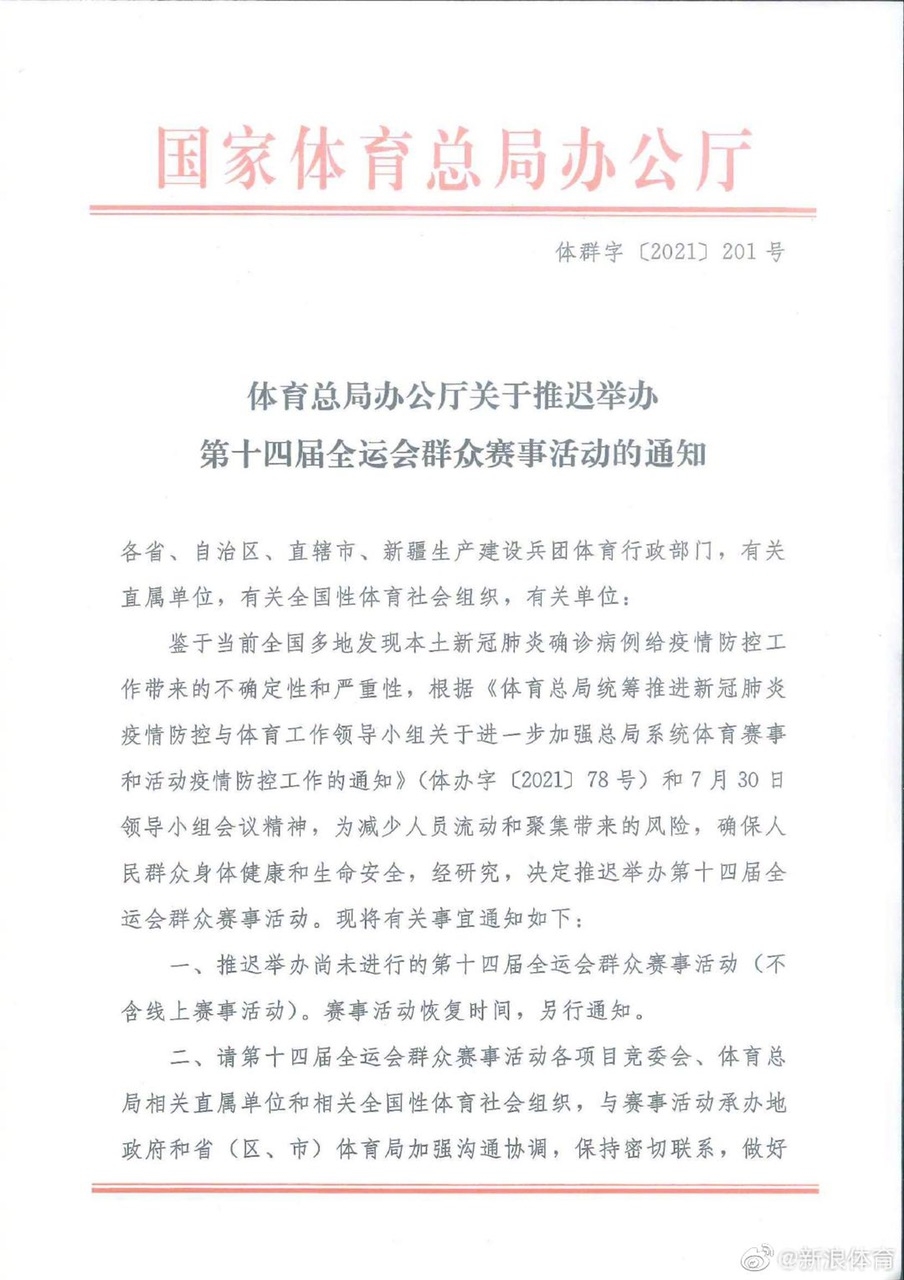 CBA联赛【#国家体育总局推迟举办全运会群众赛事# 活动】国家体育总局决定:推迟举办第十四届全运会群众赛事活动。赛事活动恢复时间,另行通知。第十四届全运会群众赛事活动各项目完赛时间可放宽到全运会闭幕之前。因新冠疫情或安全问题造成未能完成的,列为2022年全国群众单项体育赛事继续开展。