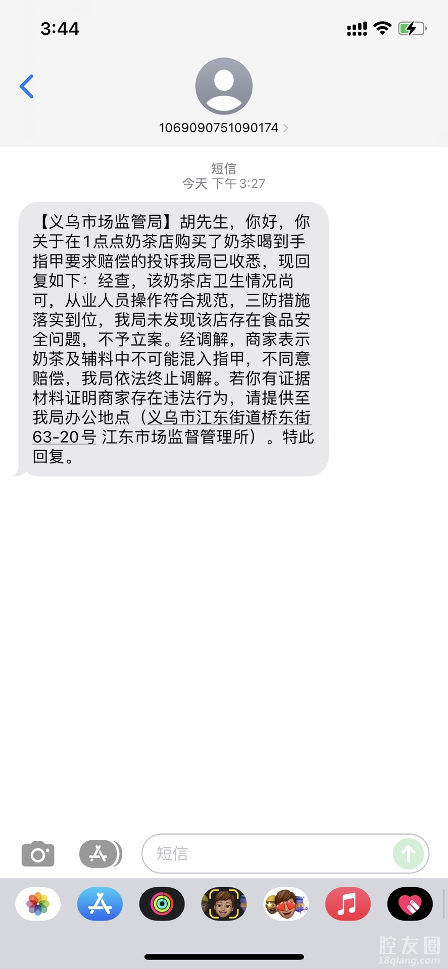 这是当地市场监督局的回复,非常的敷衍,本人到现在还保留着喝出来的手指甲!