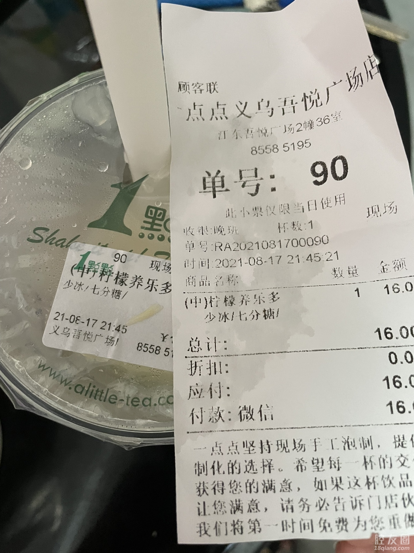 前情:本人于21年8月17日晚上21点45分在义乌吾悦广场一点点奶茶购买了一杯16元的柠檬养乐多,添加了一份免费的椰果,现场点单,而且是让店员帮忙打开,然后前往吾悦广场喜姐炸串购买食品,然后回家,家住宗塘,