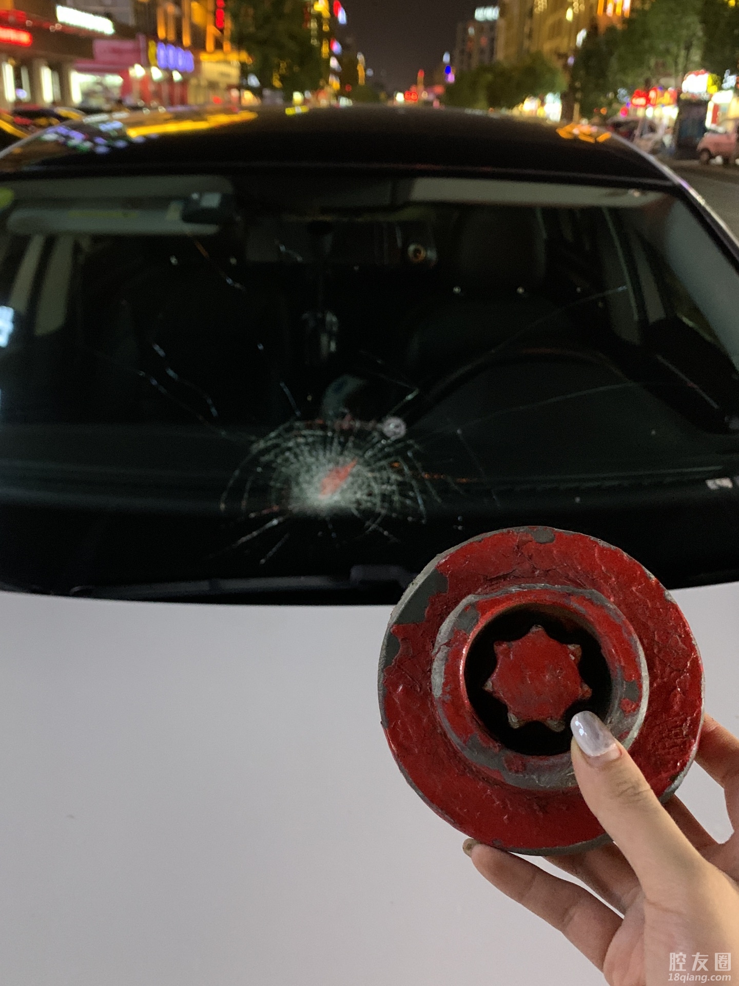 事件经过:我于工人北路上银海二区片正常行驶,经过领尚酒店,突然听到侧面有一声巨响受到惊吓后踩下刹车,停车一看发现前挡玻璃突然碎了。 看到玻璃上的红漆,在路人的指引下找到了被弹到马路对面的凶器—【消防栓盖子】