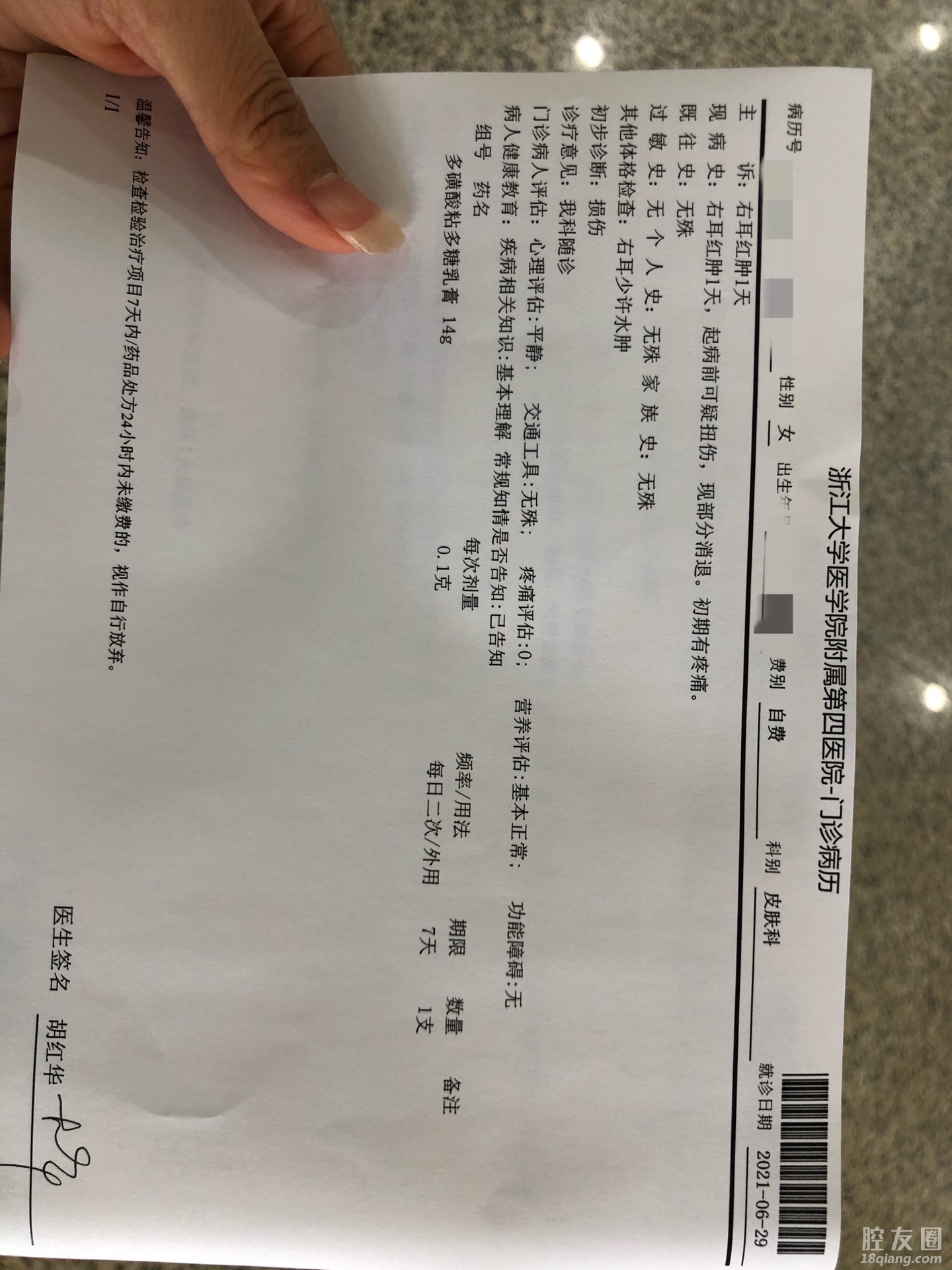 随后我要求幼儿园查询监控,幼儿园拒绝一同观看视频监控,我就要求老师先去浙四医院看急诊的耳鼻喉科。经医生诊断,伤口已经感染(附图),医生建议看皮肤科,由于当天已晚,就带孩子回家,和老师一起到幼儿园,园长同意观看其手机上录下来的视频监控。不让看幼儿园实时的监控,在我报警后才在警方的协助下看了实时的监控,通过监控内容可以看到幼儿园老师把孩子的凳子拉出去扔到隔壁教室里,在盲区拉扯孩子,明显可以看见老师很大力地拉扯孩子。