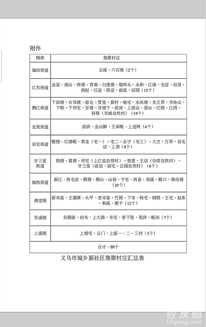 我市城乡新社区集聚村庄调整方案已经市委、市政府研究同意,全市新社区集聚村庄调整为89个(具体名单详见附表),请按此有序实施集聚建设。