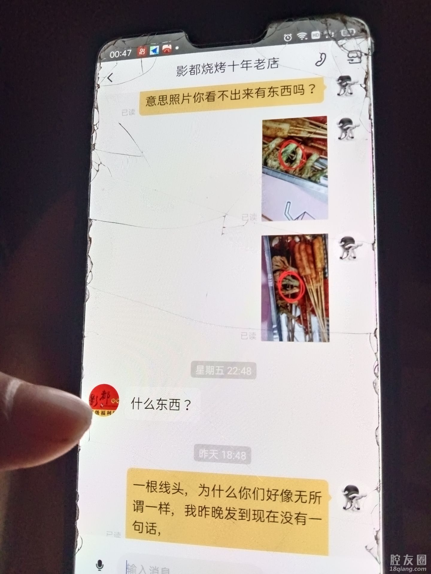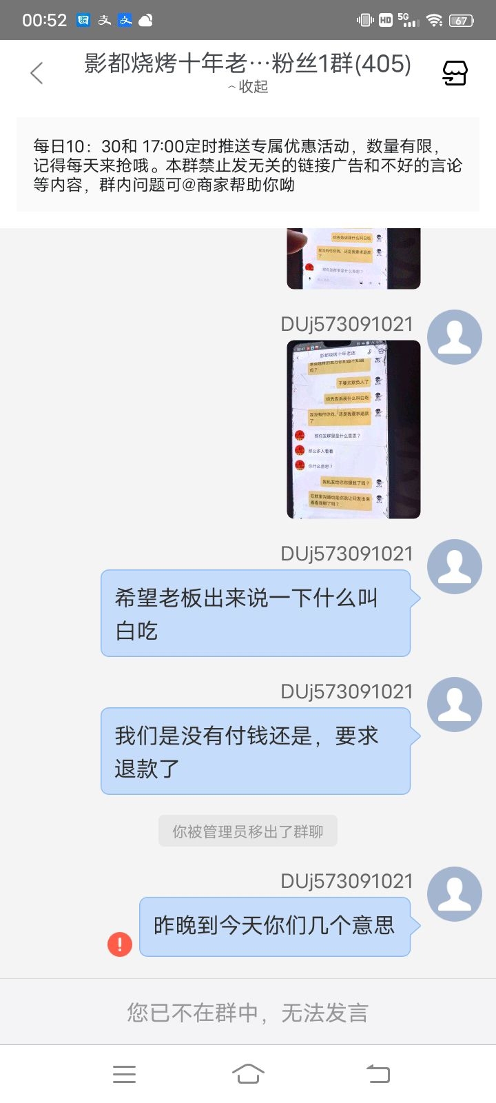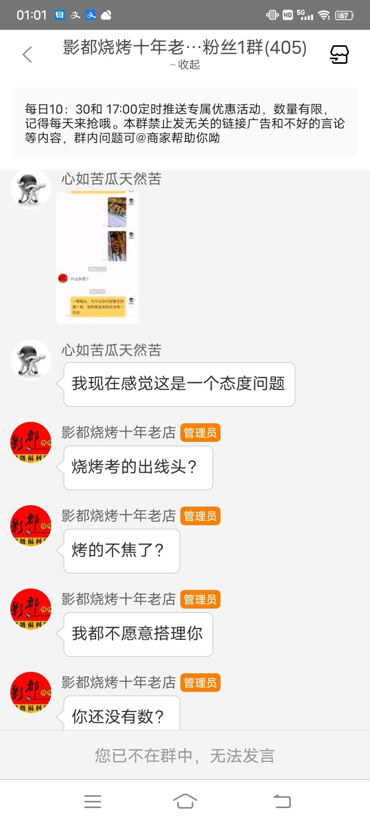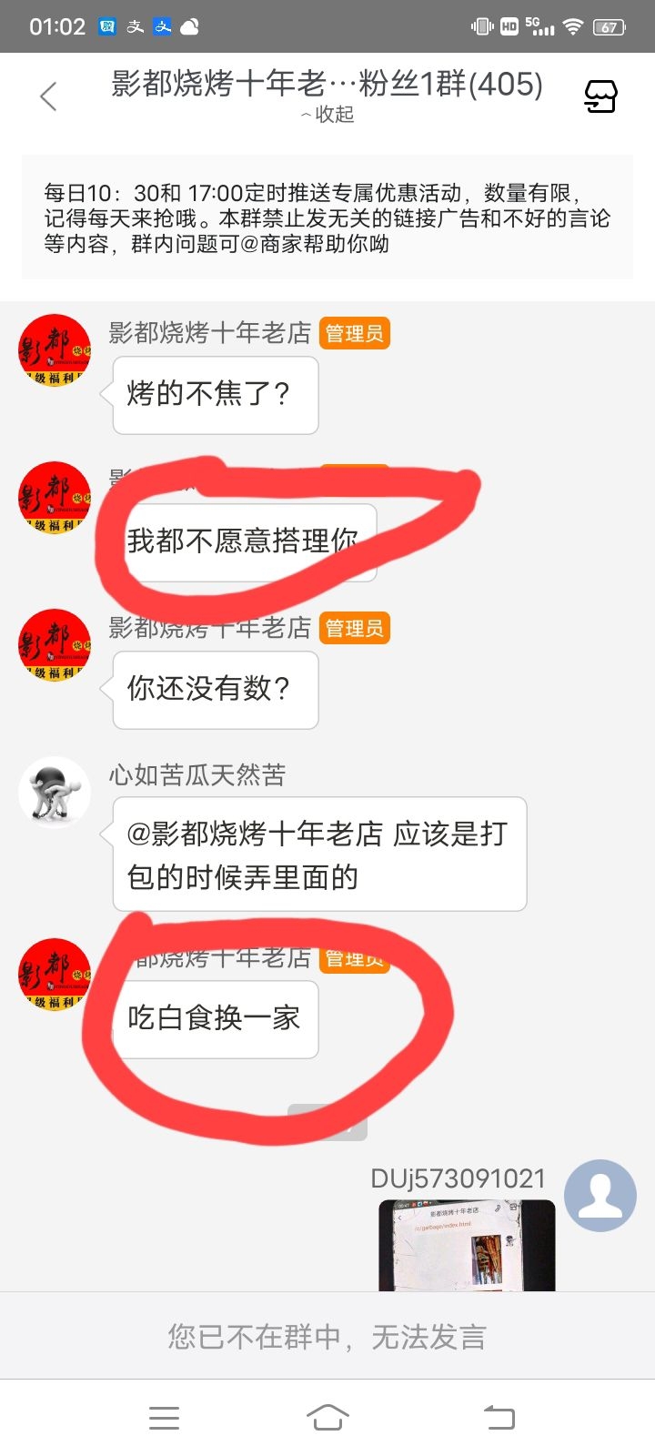 事情是这样的,我要来曝光美团上的一家烧烤店,叫什么下面有截图,昨天用我老公号,点了一份烧烤,当时里面有一个白色线头,个人估计是商家打包的时候弄到的,所以拍照发给商家,也没有什么要求就是随便一发,结果商家爱答不理的,心里难受,但是也没有说什么,今天我就去美团上,说说了两句,至于说什么请看下面截图,但是商家不理我期间我没有骚扰商家,没有要求退款也没有投诉更没有差评,但是商家不搭理我,心里真心不舒服,看见他们在群里讨论,我也讨论几句问问商家为什么不理我,结果商家说让我发群里,我就截图发过去,商家来了一句说我吃白食,我的天啦,但是有线头我就要一个态度都不可以吗?