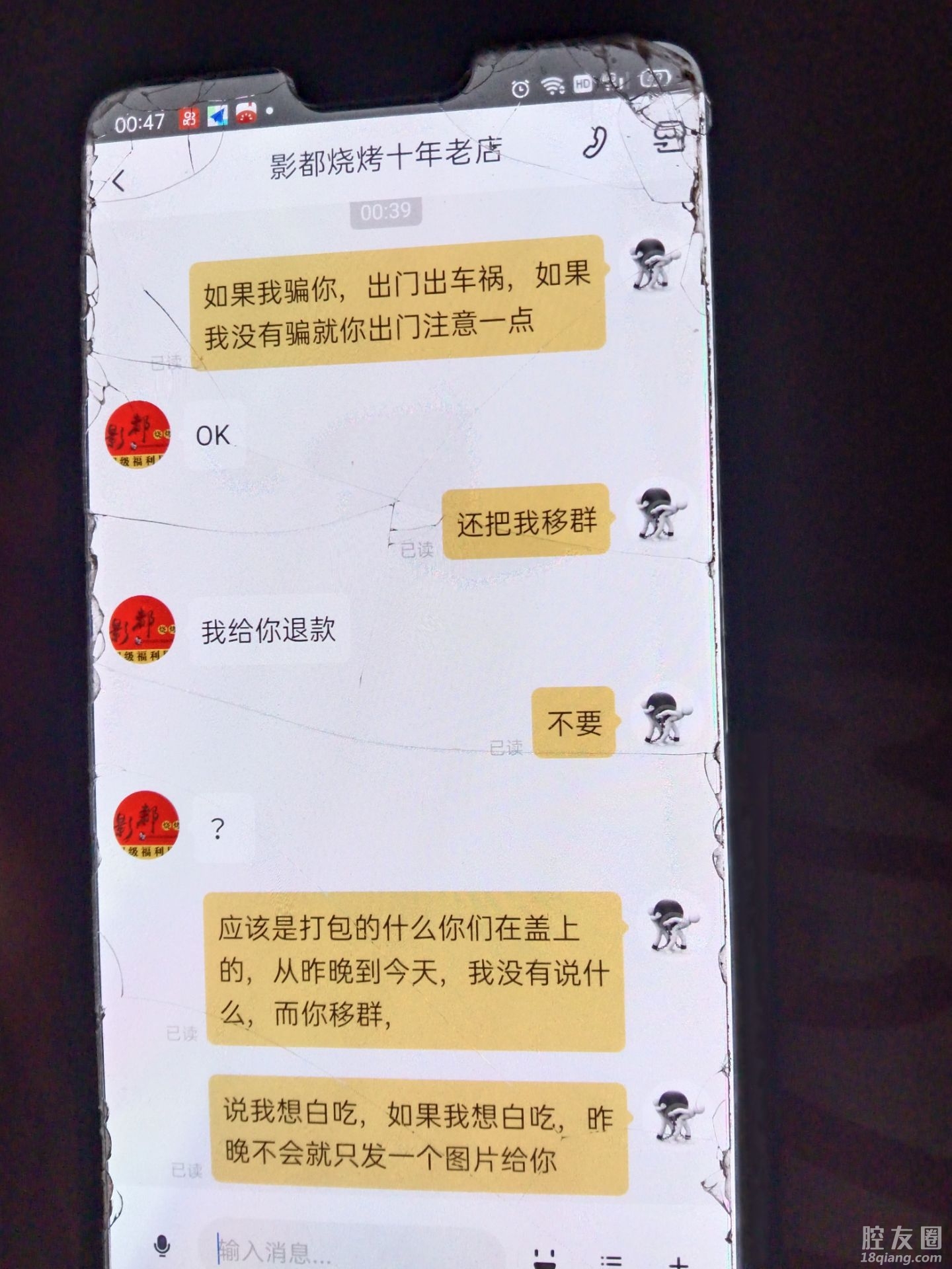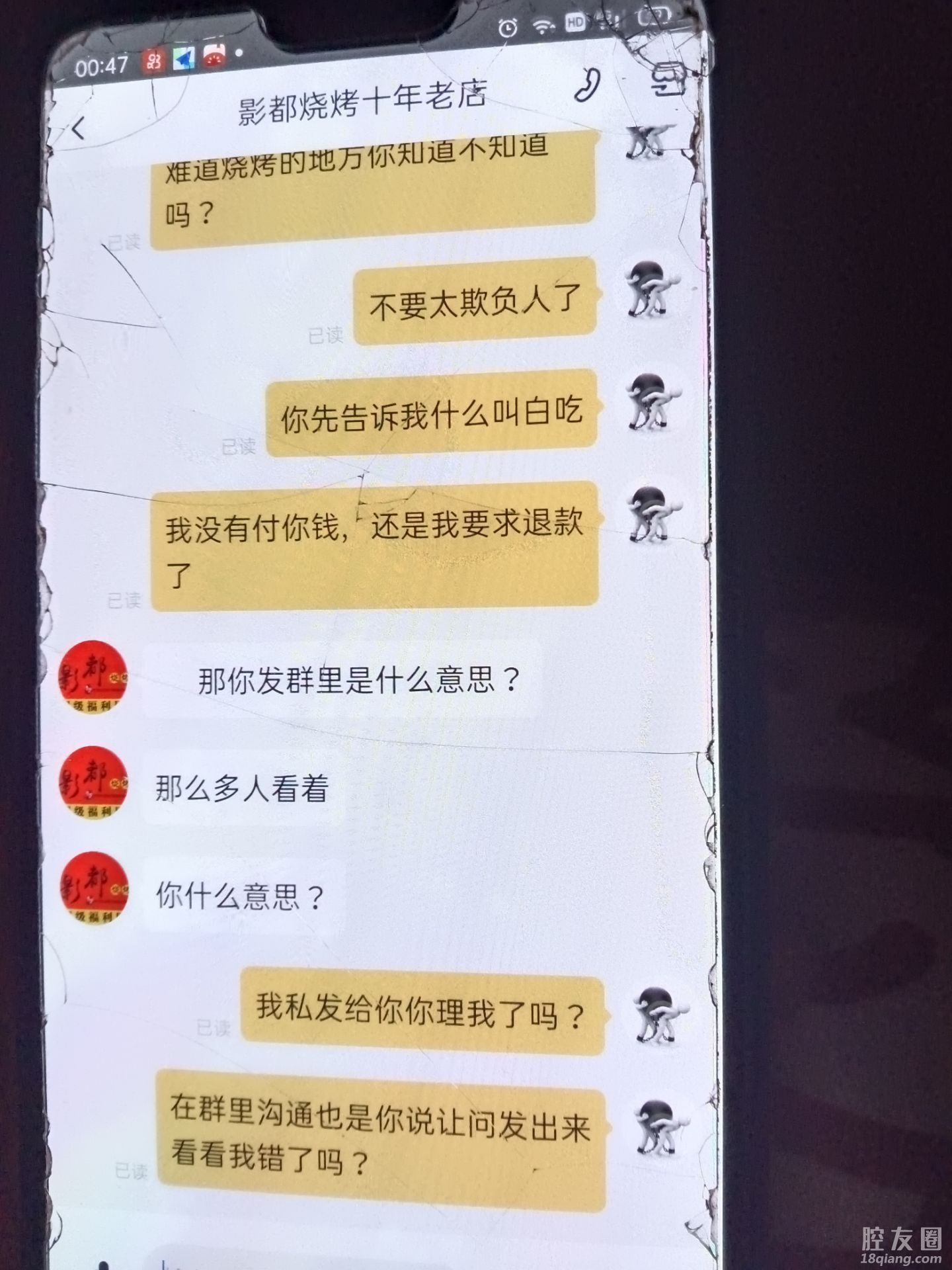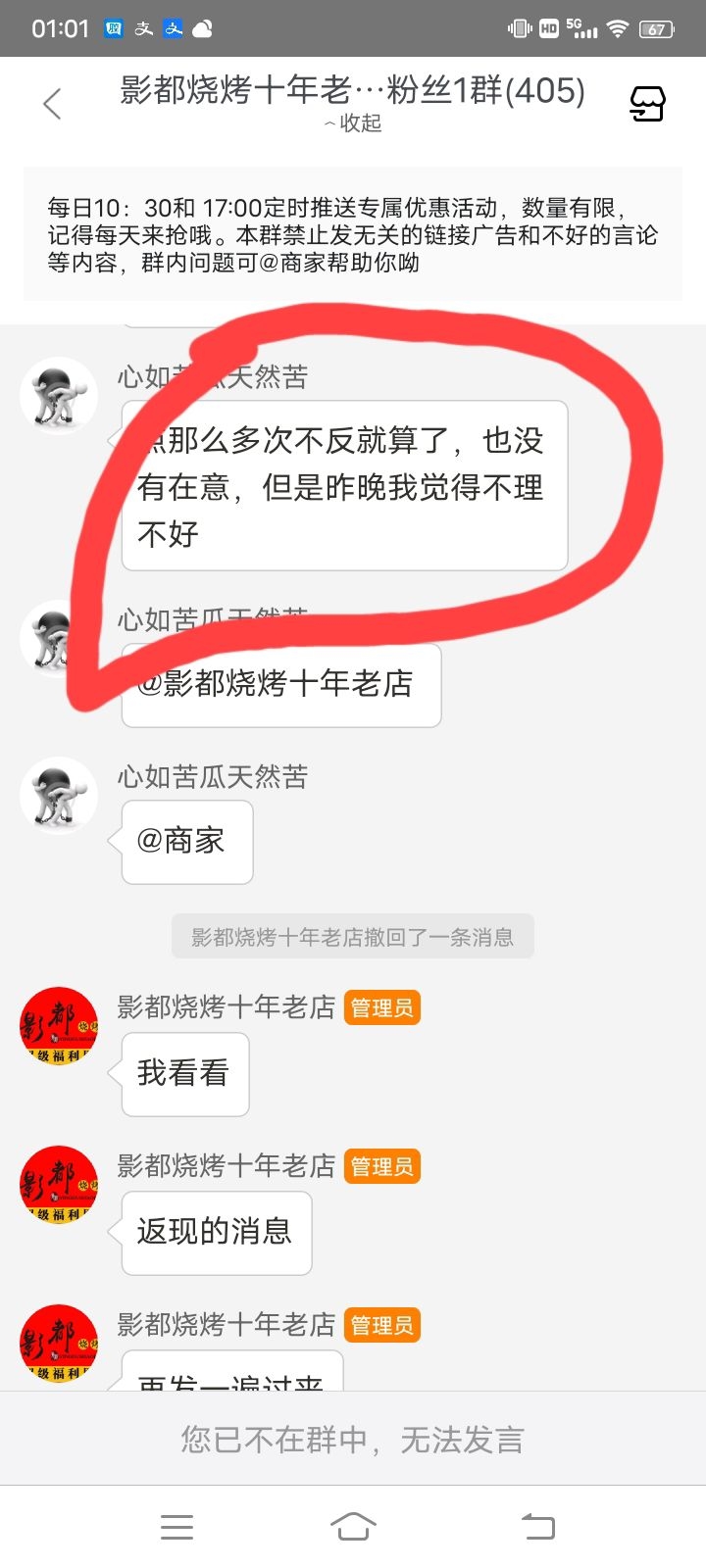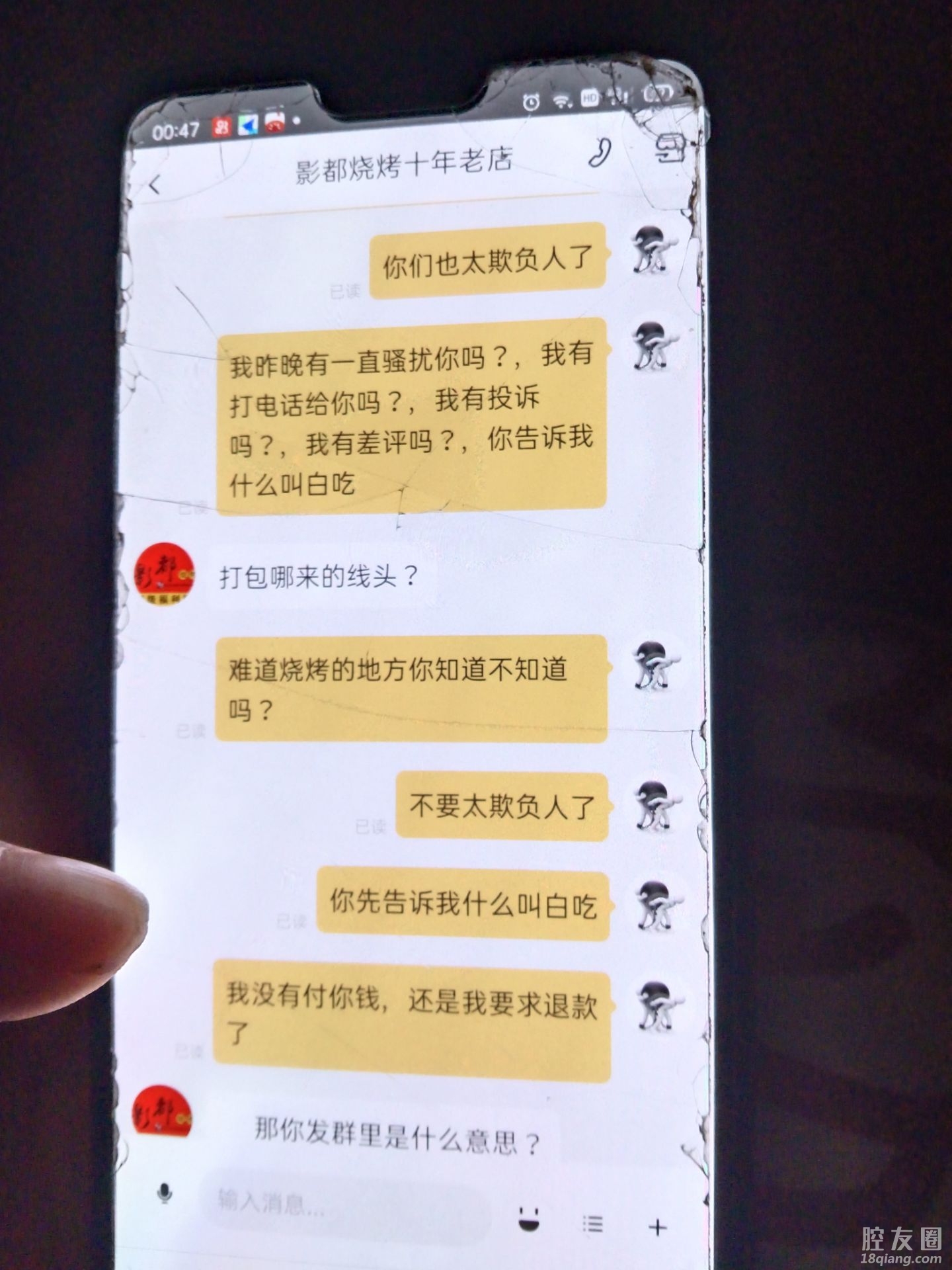 事情是这样的,我要来曝光美团上的一家烧烤店,叫什么下面有截图,昨天用我老公号,点了一份烧烤,当时里面有一个白色线头,个人估计是商家打包的时候弄到的,所以拍照发给商家,也没有什么要求就是随便一发,结果商家爱答不理的,心里难受,但是也没有说什么,今天我就去美团上,说说了两句,至于说什么请看下面截图,但是商家不理我期间我没有骚扰商家,没有要求退款也没有投诉更没有差评,但是商家不搭理我,心里真心不舒服,看见他们在群里讨论,我也讨论几句问问商家为什么不理我,结果商家说让我发群里,我就截图发过去,商家来了一句说我吃白食,我的天啦,但是有线头我就要一个态度都不可以吗?
