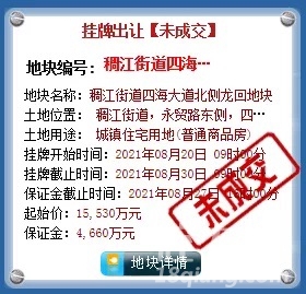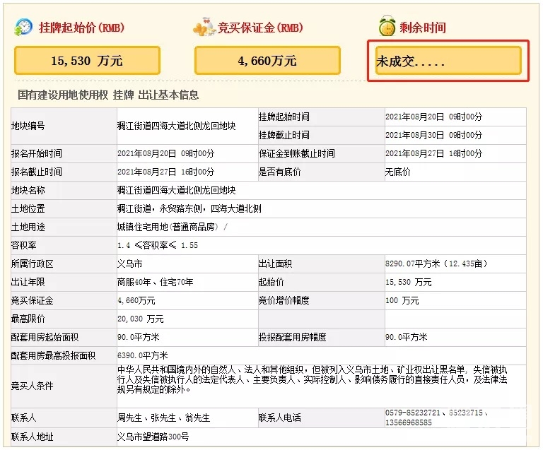 8月20日上午,义乌市稠江街道四海大道北侧龙回地块挂牌时间截止,随后出让页面显示未成交,疑为无人出价导致流拍。